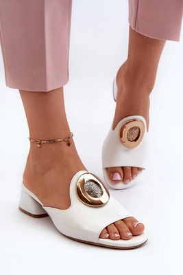 +1Eleganckie Lakierowane Klapki Damskie Na Niskim Obcasie Ze Złotą Ozdobą Białe Uzimila