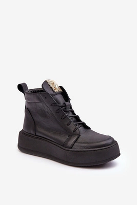Skórzane Buty Sportowe Damskie na Platformie Czarne Lemar Manish