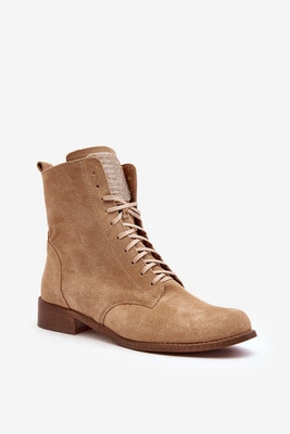 Sznurowane Botki Damskie Z Ozdobą Skórzane Ciemnobeżowe Nicole 2833