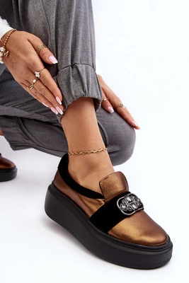 +1Skórzane Półbuty Damskie Na Platformie Z Ozdobą Laura Messi 2697/744-300 Złote