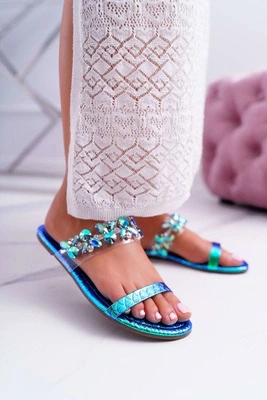 +2Damskie Klapki Z Cyrkoniami Lu Boo Benzynowe Niebieskie Mediana