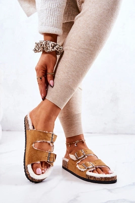 Zamszowe Ocieplane Klapki Camel Adeline