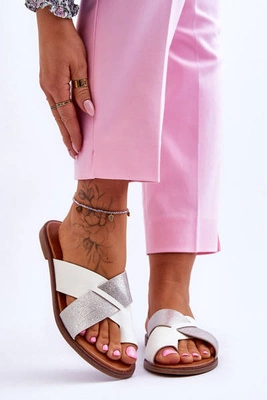 +1Klasyczne Damskie Skórzane Klapki Biało-Srebrne Nancy