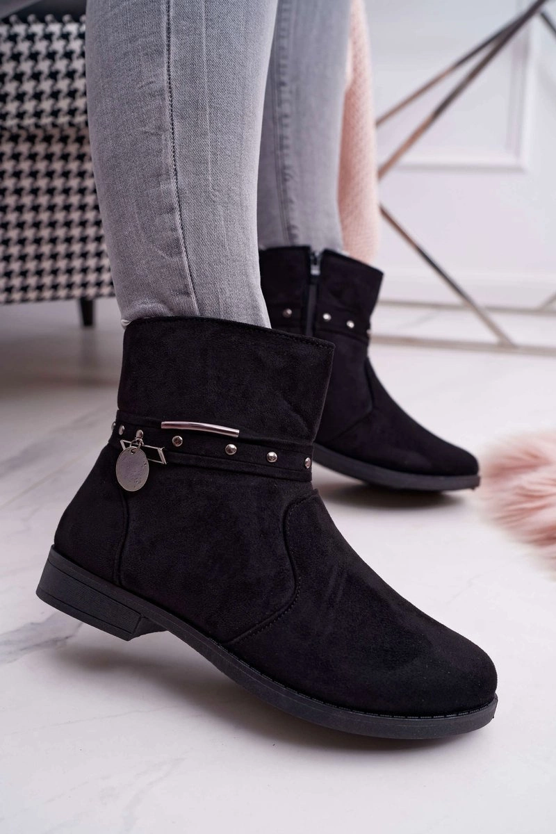 Damskie Botki Płaski Obcas Ocieplane Czarne Verte