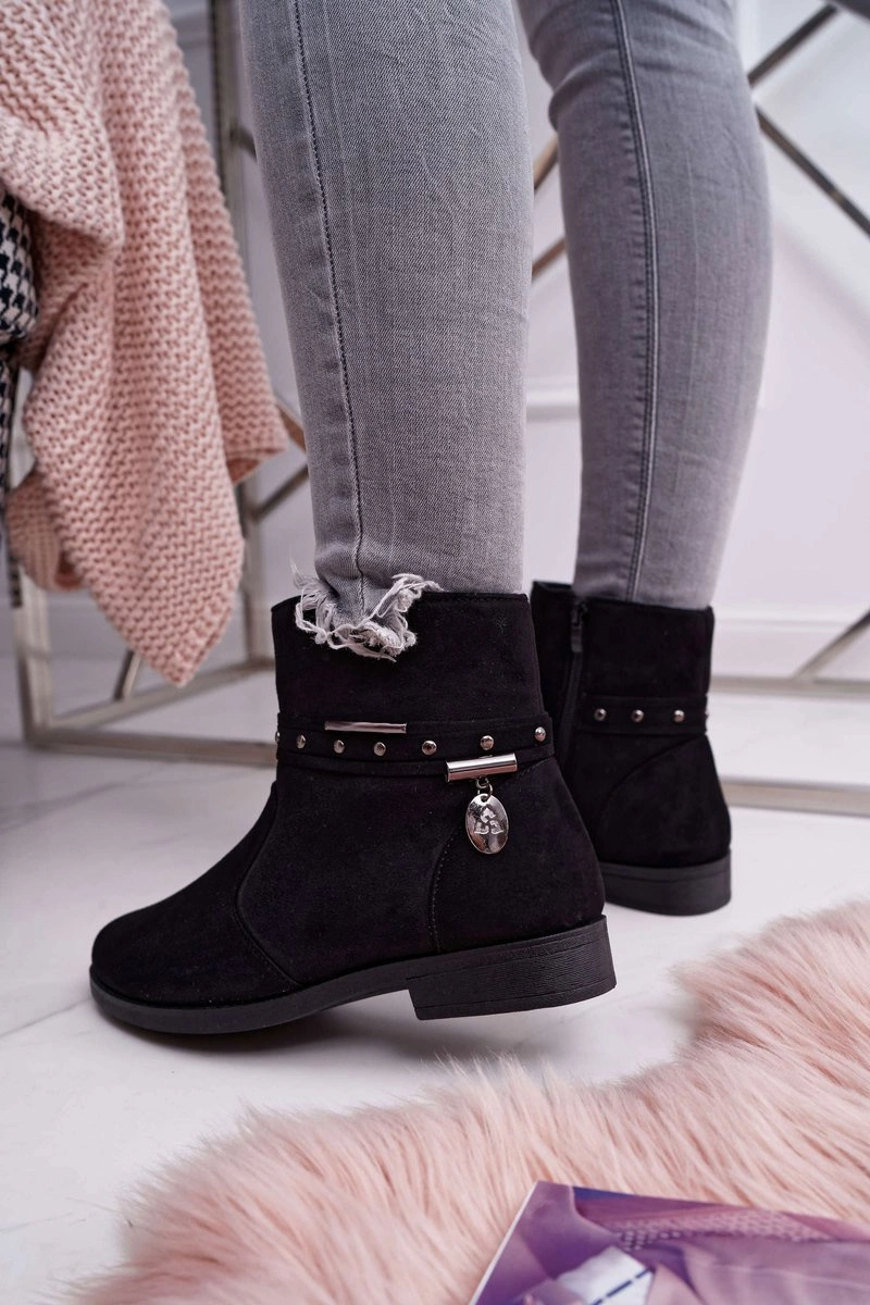 Nie wiesz co na siebie włożyć? To nic prostszego! Wybierz czarne botki, które pasują dosłownie do każdej stylizacji. Eko-zamsz z którego zostały wykonane pięknie wygląda a delikatna klamra wokół kostki nadaje im mocniejszego charakteru. Wnętrze buta pokryte kocem obuwniczym z krótkim włosiem, co zapewni nam komfort i ciepło nawet w chłodniejsze dni. Suwak na boku ułatwi zakładanie. Przy wyborze rozmiaru prosimy sugerować się tabelą rozmiarów.
