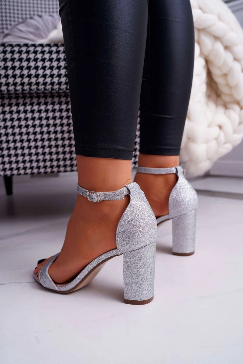 Sandały Damskie Na Słupku Brokatowe Srebrne Berglat