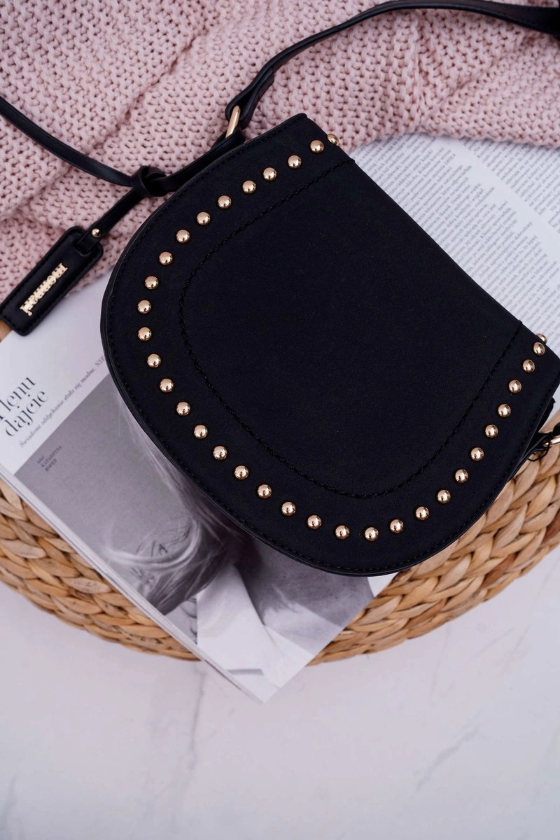 Torebka damska na co dzień małej wielkości z ozdobnymi nitami wokół klapy (23, 20, 10cm), zawieszona na regulowanym pasku, jednokomorowa, z jasną podszewką w środku. Polecamy ten model do codziennych stylizacji.