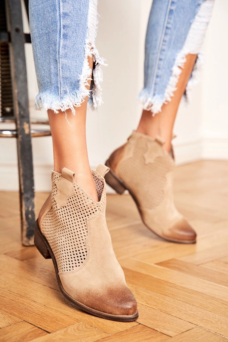 Botki to nie tylko buty na chłodne dni. Świetnie sprawdzą się również podczas tworzenia wiosennych stylizacji. Ażurowy design oraz zapinanie na zamek z tyłu cholewki. Botki w całości wykonane z naturalnego weluru. Produkt Polski firmy Exquisite co gwarantuje nam komfort oraz wysoką jakość wykonania. Idealne do zwiewnych sukienek oraz jeansowych spodni. Przy wyborze rozmiaru prosimy sugerować się tabelą rozmiarów.