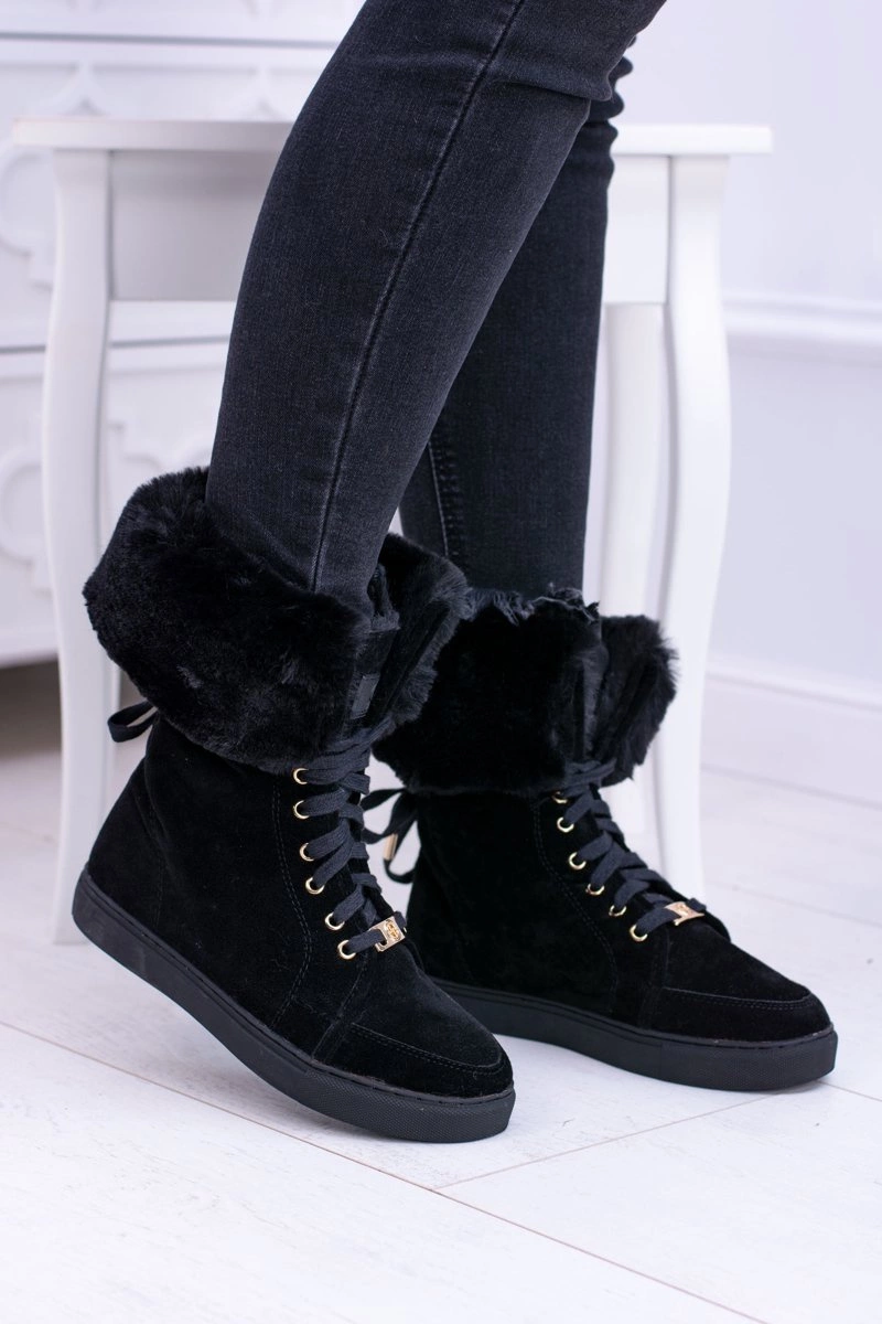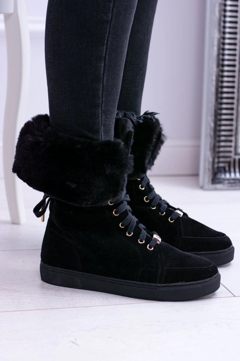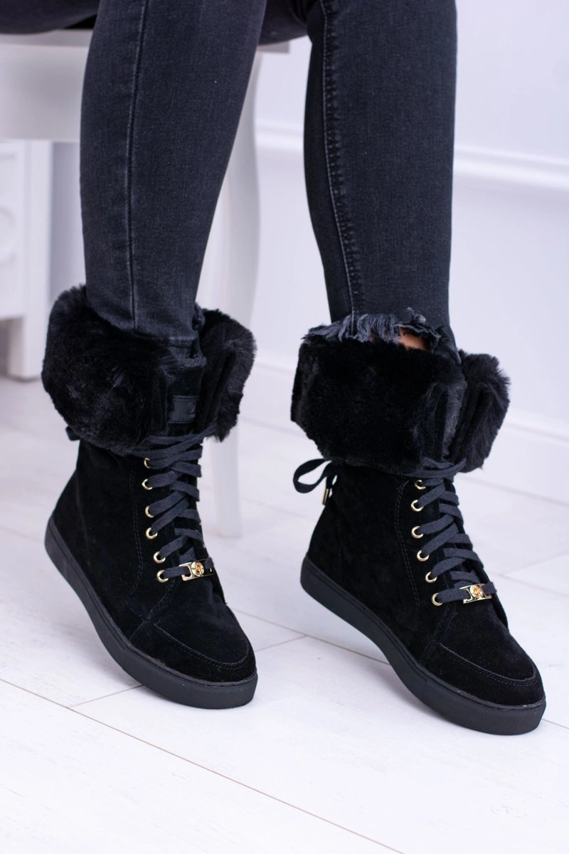 Czarne Zamszowe Botki LU BOO Timberki z Futrem