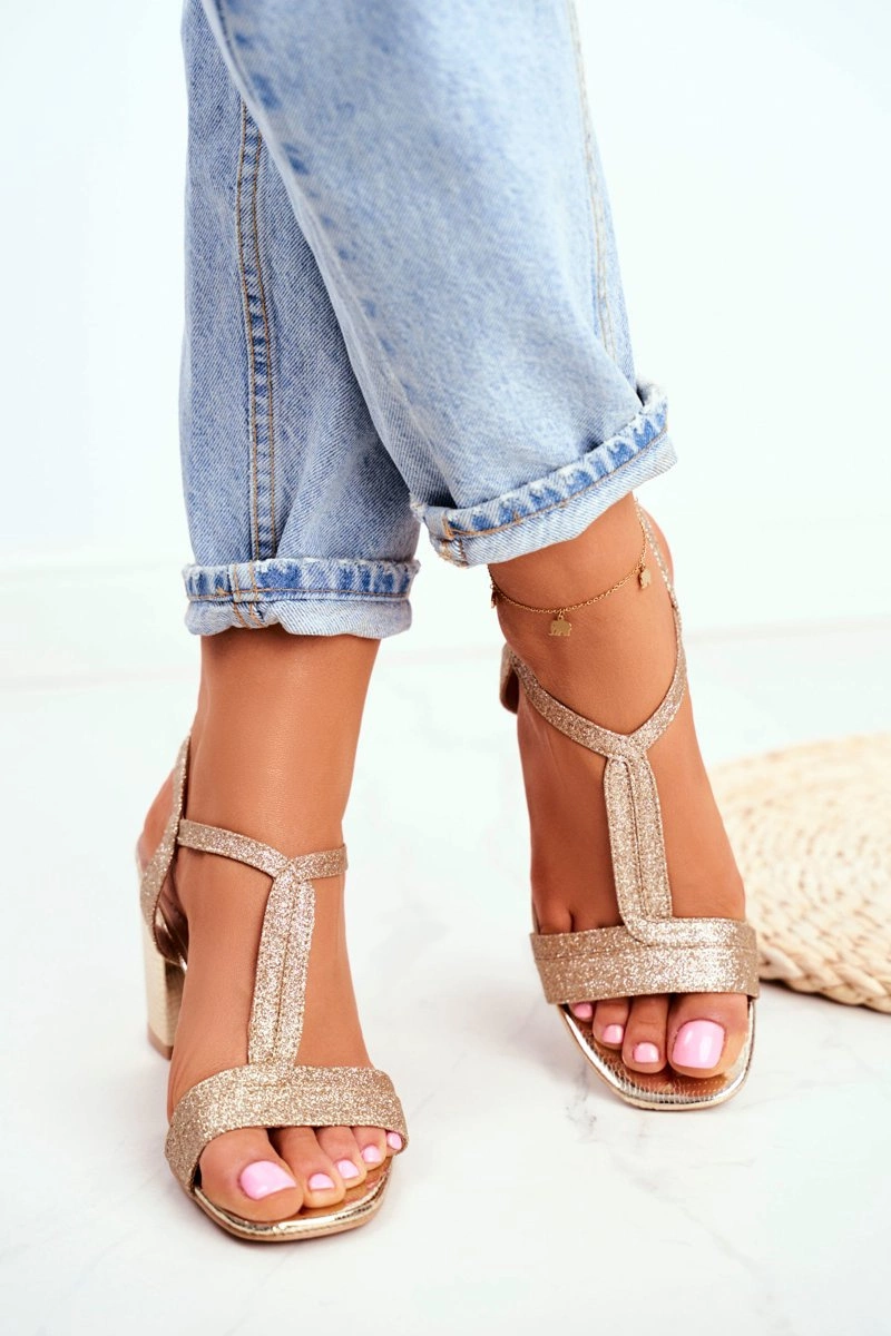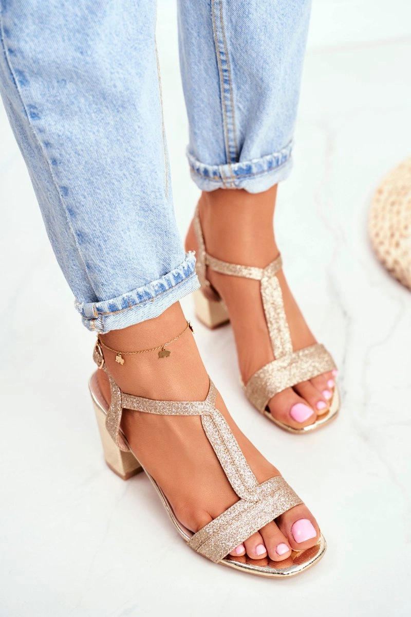 Sandały Damskie Na Słupku Brokatowe Złote Perfecto