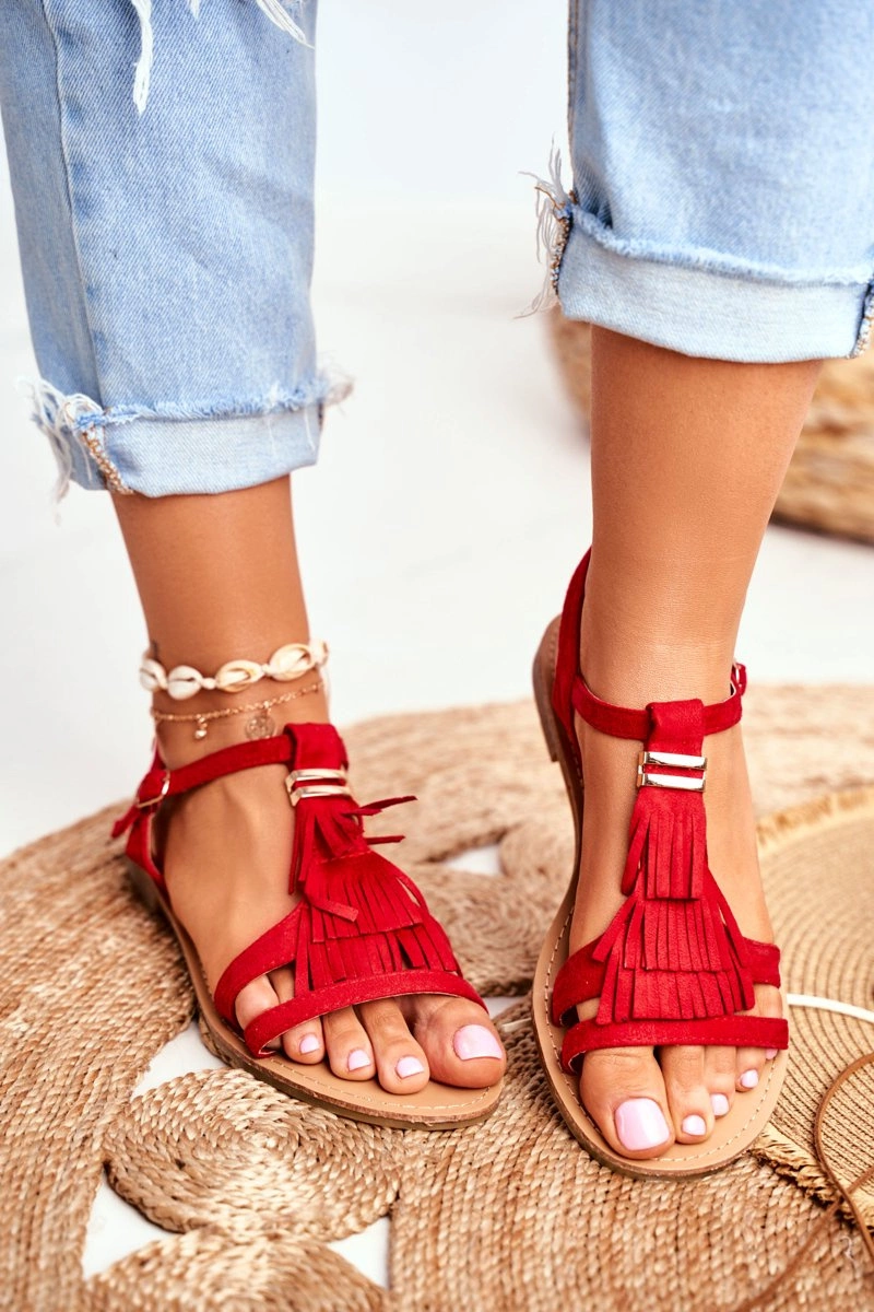 Sandały Damskie Płaskie Zamszowe Boho Czerwone Lucami