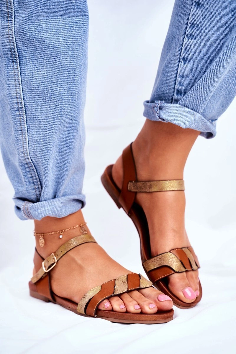Skórzane Płaskie Sandały S.Barski Brązowo-Złote