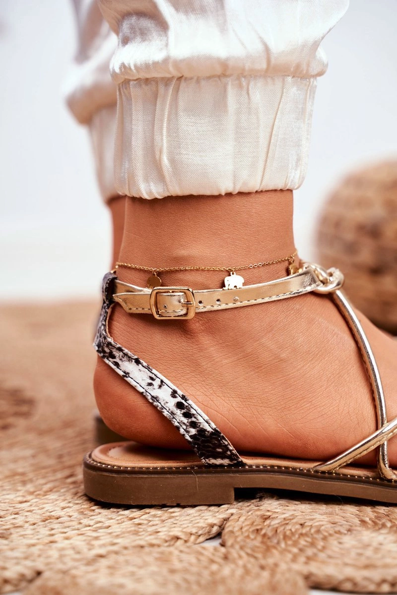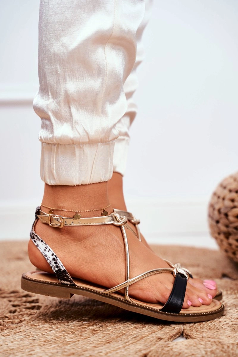 Skórzane Płaskie Sandały S.Barski LJ281 Czarno-Złote