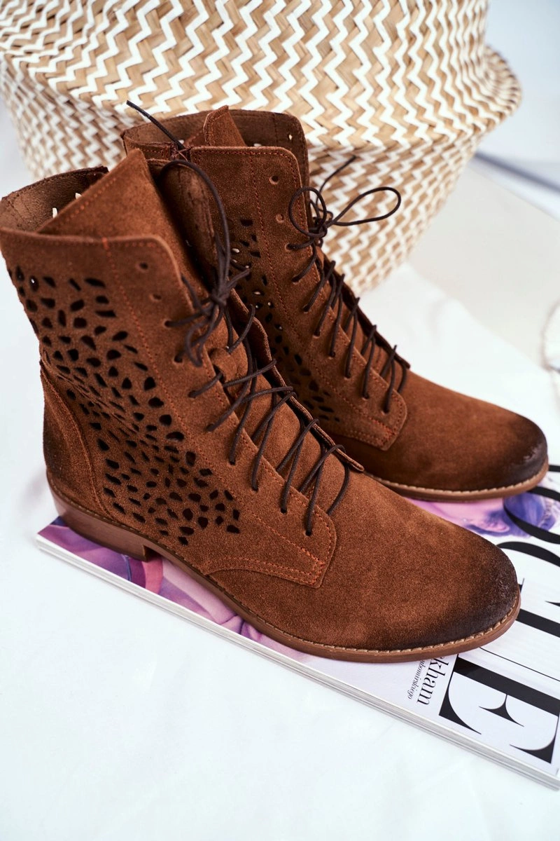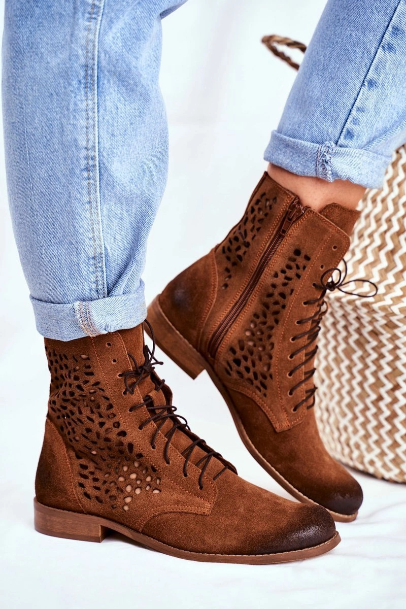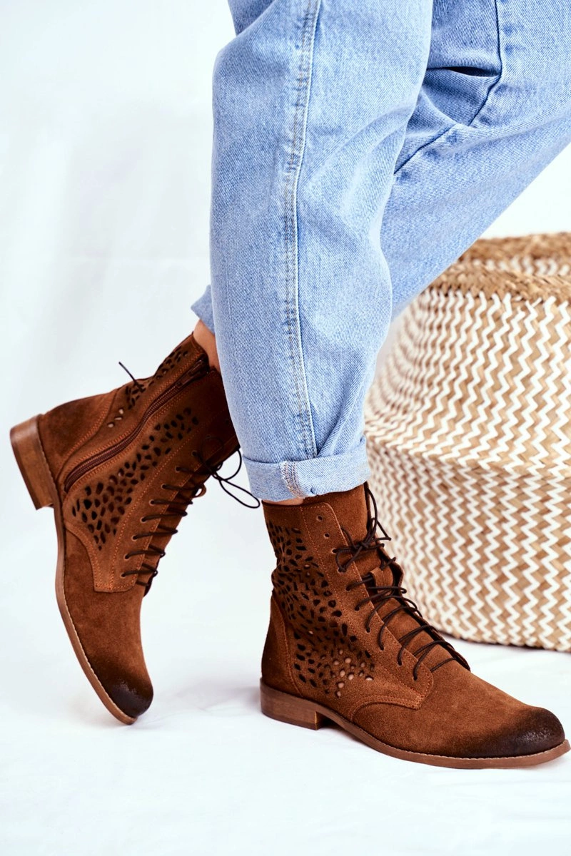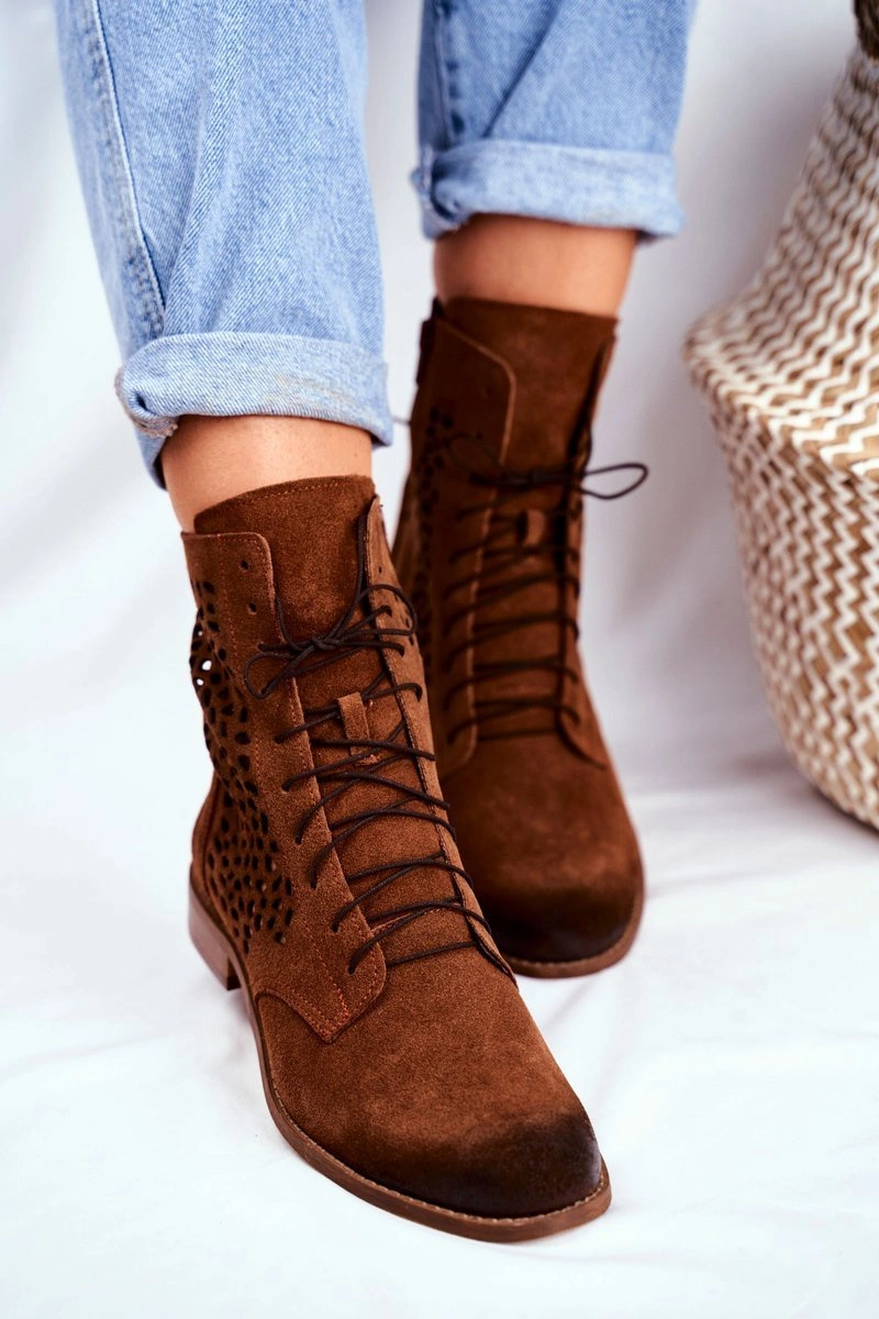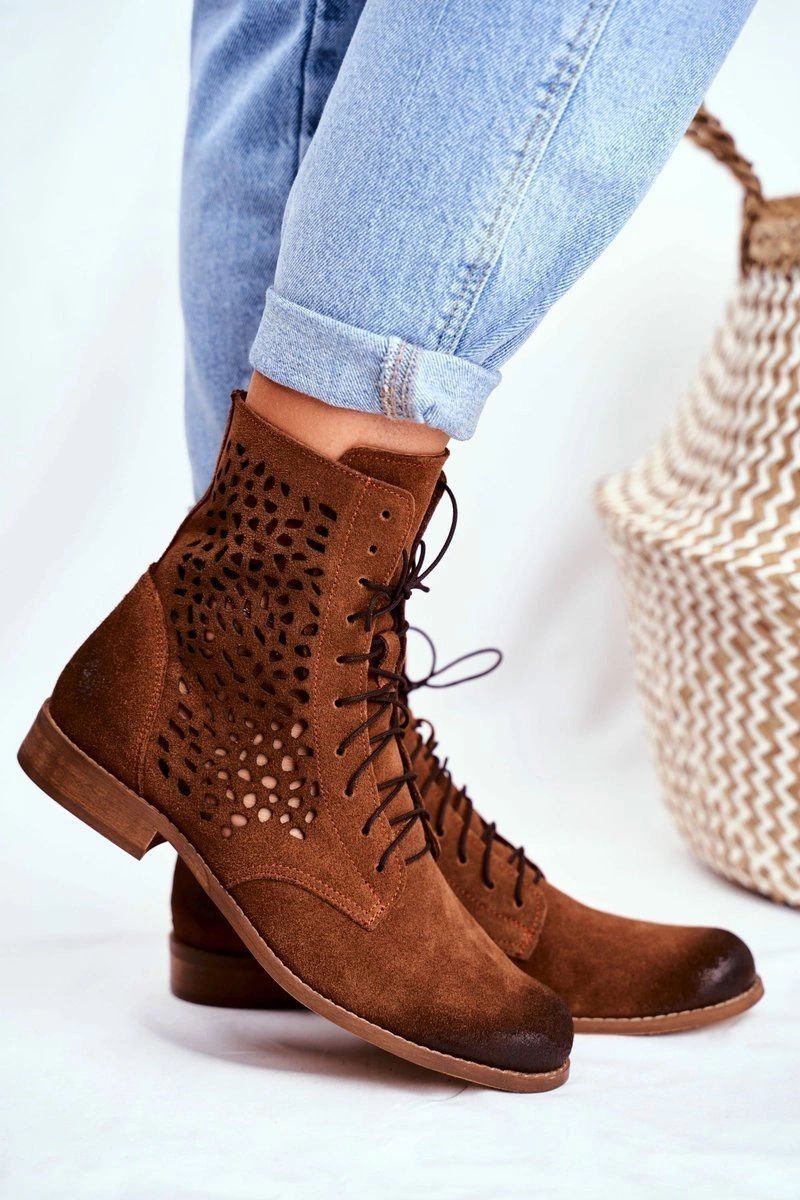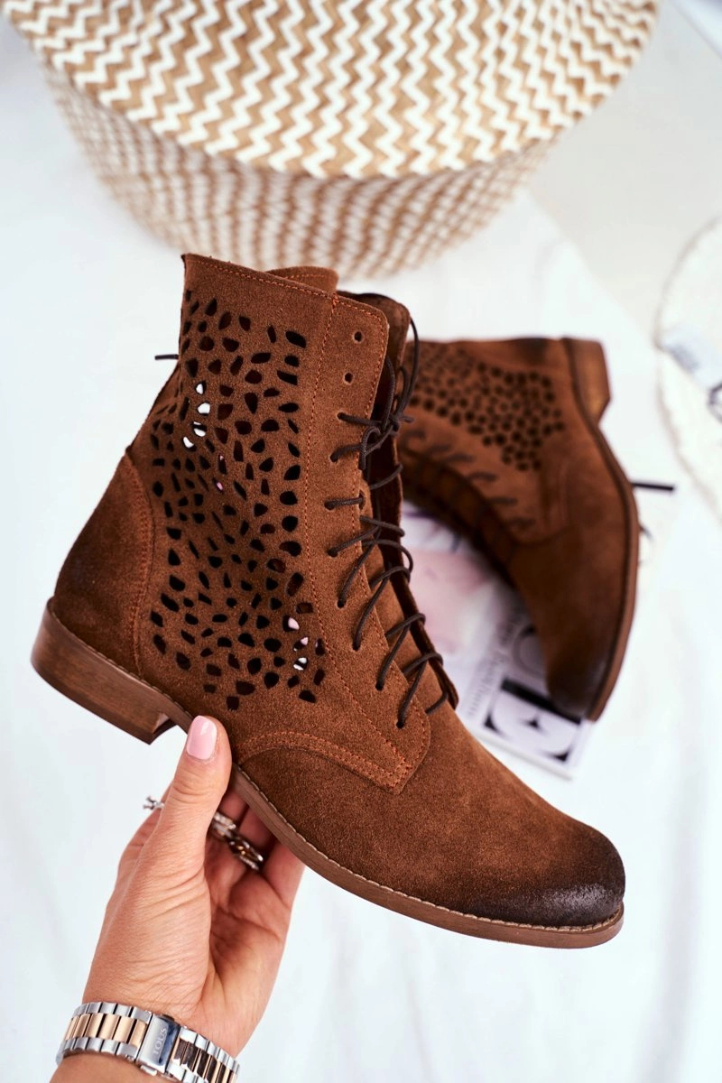 Botki to nie tylko buty na chłodne dni. Świetnie sprawdzą się również podczas tworzenia wiosennych stylizacji. Produkt polski, wykonany w całości ze skóry zamszowej. Delikatny, płaski obcas uniesie Twoją sylwetkę i podkreśli stylizacje. Ażurowy styl nigdy nie wyjdzie z mody. Idealne do zwiewnych sukienek oraz jeansowych spodni. Przy wyborze rozmiaru prosimy sugerować się tabelą rozmiarów.