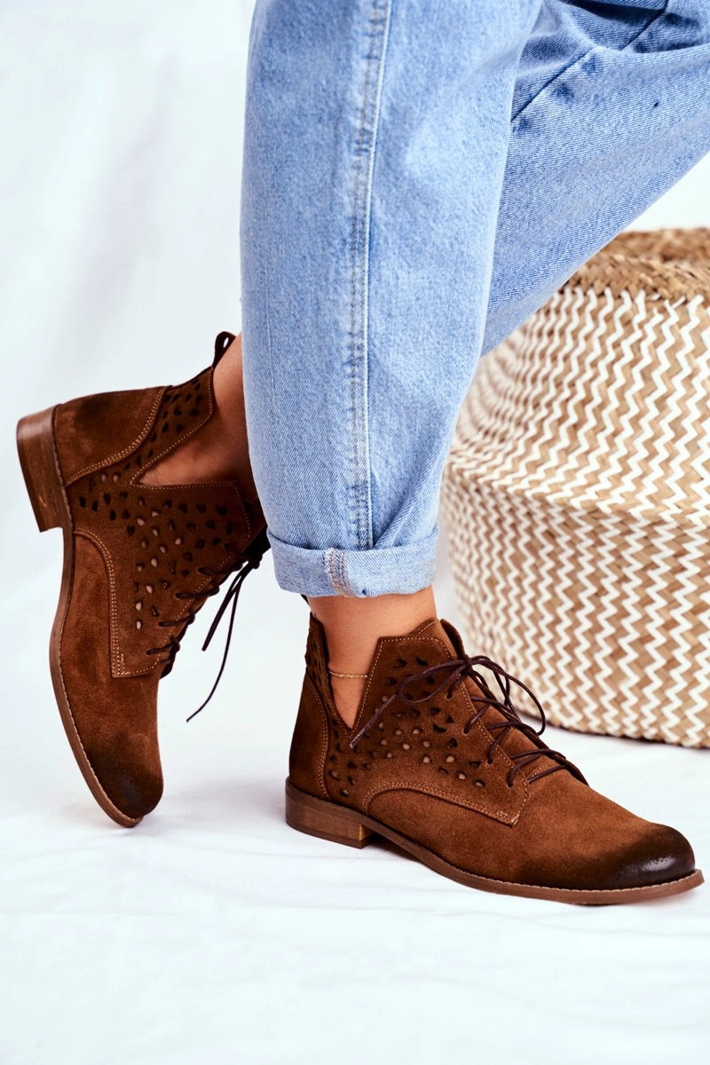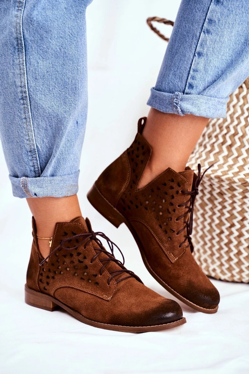 Botki to nie tylko buty na chłodne dni. Świetnie sprawdzą się również podczas tworzenia wiosennych stylizacji. Produkt polski, wykonany w całości ze skóry zamszowej. Delikatny, płaski obcas uniesie Twoją sylwetkę i podkreśli stylizacje. Ażurowy styl nigdy nie wyjdzie z mody. Idealne do zwiewnych sukienek oraz jeansowych spodni. Przy wyborze rozmiaru prosimy sugerować się tabelą rozmiarów.