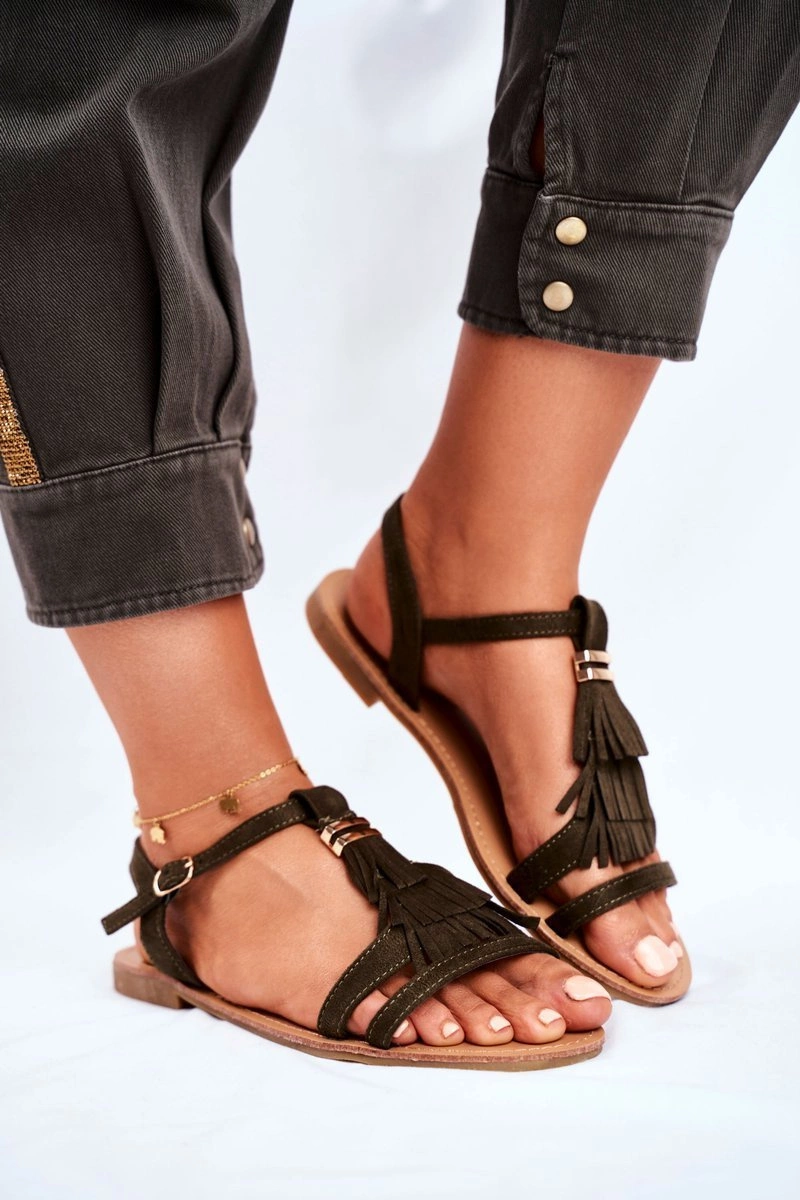 Sandały Damskie Płaskie Zamszowe Boho Oliwkowe Lucami