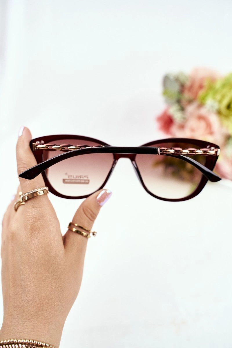 Okulary posiadają szkła z pięknym gradientem brązu oraz modne ozdoby na zausznikach widoczne na zdjęciach.