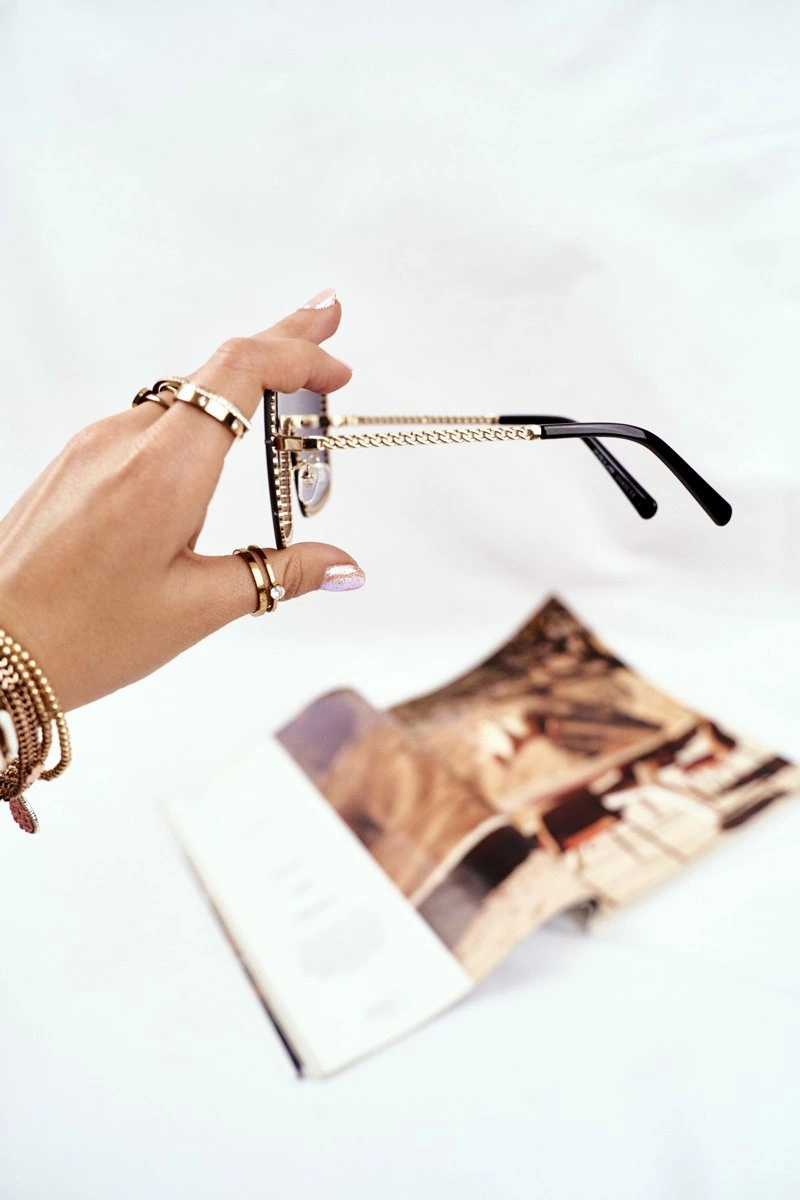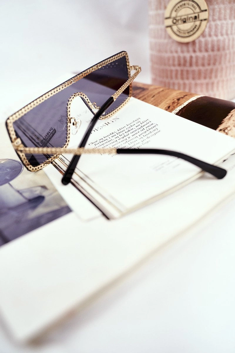 Okulary posiadają szkła z pięknym efektem gradientu oraz modne, złote ozdoby na zausznikach, a także dookoła szkieł, widoczne na zdjęciach.Zdjęcia są naszego autorstwa i przedstawiają sprzedawany produkt.