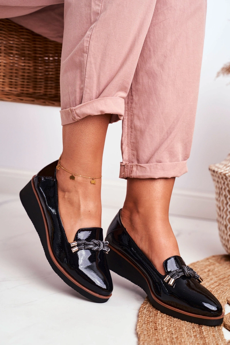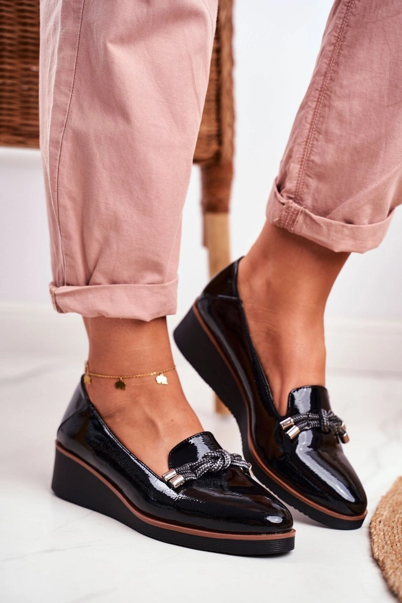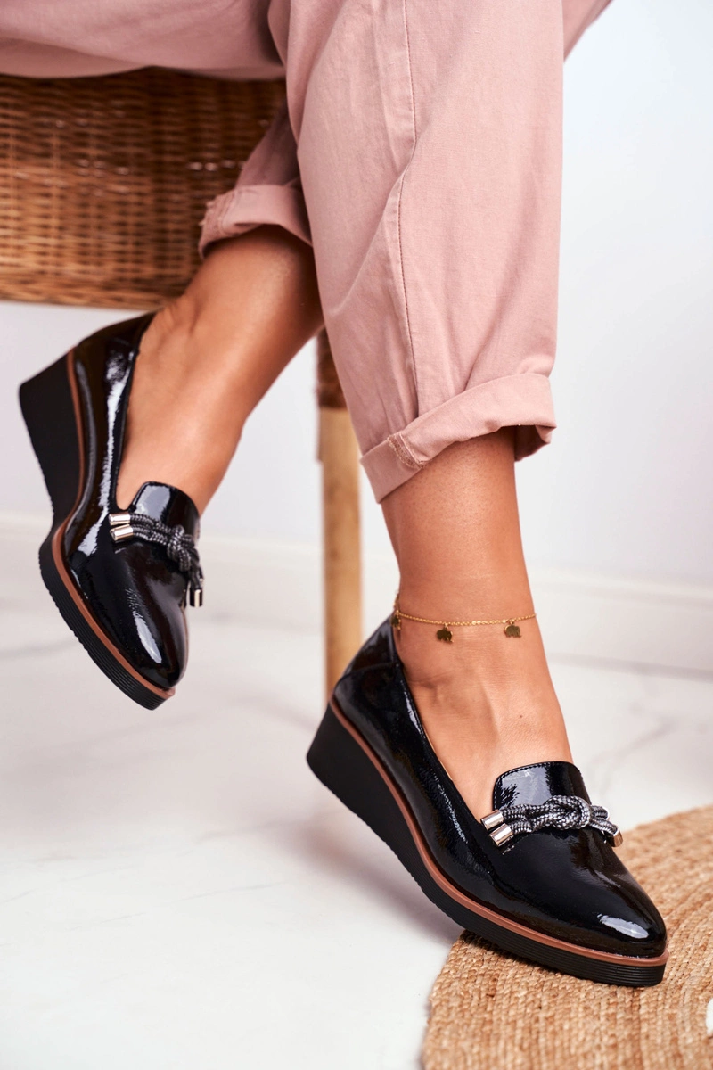 Mokasyny Damskie Czarne Lakierowane Na Koturnie Abba