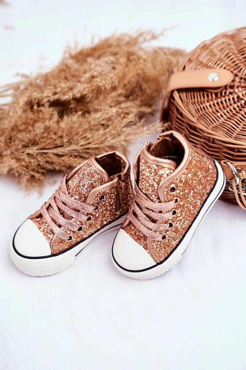 Trampki dziecięce pokryte delikatnym brokatem. Buty dobrze dopasowują się do kształtu stopy dzięki miękkiej, materiałowej cholewce. Posiadają antypoślizgową podeszwę. Koniecznie sprawdź całą naszą kolekcję trampek dziecięcych! Przy wyborze rozmiaru prosimy sugerować się tabelą rozmiarów.