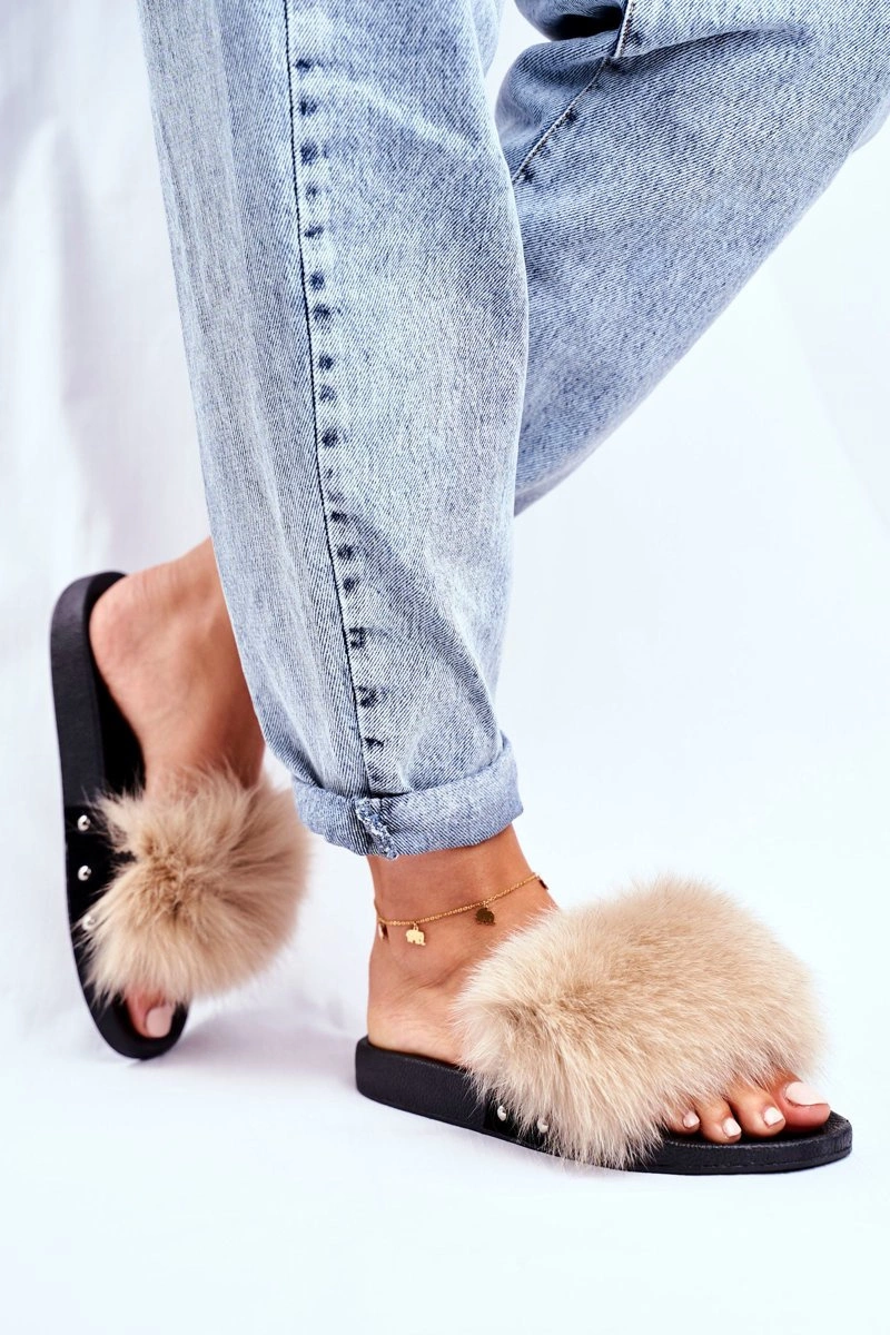 Klapki Damskie z Naturalnym Futerkiem Beżowe Bushido