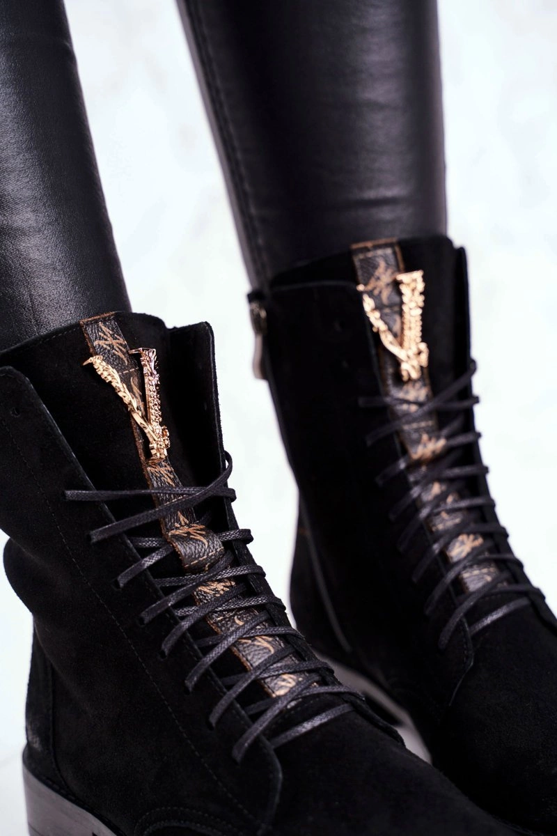 Botki to nie tylko buty na chłodne dni. Świetnie sprawdzą się również podczas tworzenia wiosennych stylizacji. Buty zostały wykonane z naturalnej skóry nubukowej. Zdobienie w postaci złotej literki V wygląda przepięknie i podkreśla ich stylistykę. Zakładanie ułatwi wszyty na boku suwak, natomiast o lepsze dopasowanie zadbają sznurowadła. Botki oparte na delikatnym płaskim obcasie. Przy wyborze rozmiaru prosimy sugerować się tabelą rozmiarów.