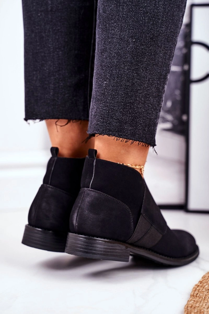 Czarne botki w niecodziennej stylistyce. Zachwyć innych swoimi stylizacjami i wyznacz trendy tego sezonu! Wierzch wykonany ze skóry ekologicznej imitującej nubuk. Wnętrze pokryte kocem obuwniczym, który zagwarantuje nam ciepło nawet w te chłodniejsze dni. Zakładanie ułatwi wszyty na boku suwak. Przy wyborze rozmiaru prosimy sugerować się tabelą rozmiarów.