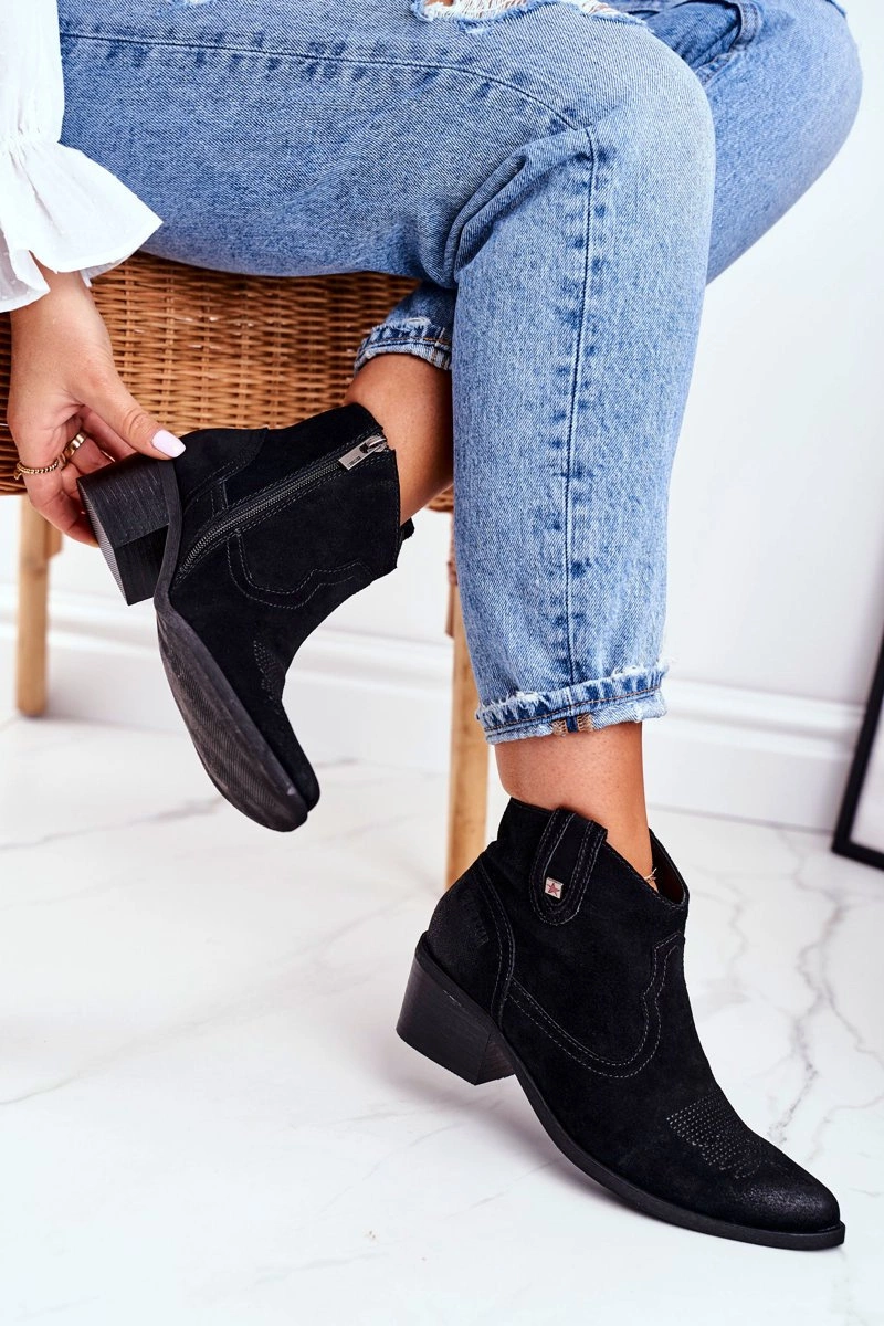 Botki na obcasie cieszą się dużą popularnością wśród kobiet. Nic dziwnego, skoro można je dopasować do praktycznie każdej stylizacji. Prezentowany model o kroju kowbojek wygląda cudownie, a przeszycia na nosku nadają im niesamowitego stylu. Wierzch to naturalna skóra zamszowa. Botki marki Big Star z całą pewnością muszą znaleźć się w Twojej garderobie. Przy wyborze rozmiaru prosimy sugerować się tabelą rozmiarów.