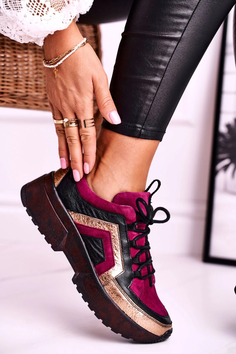 Damskie Półbuty Sneakersy Maciejka Skórzane Bordowe 04731-23