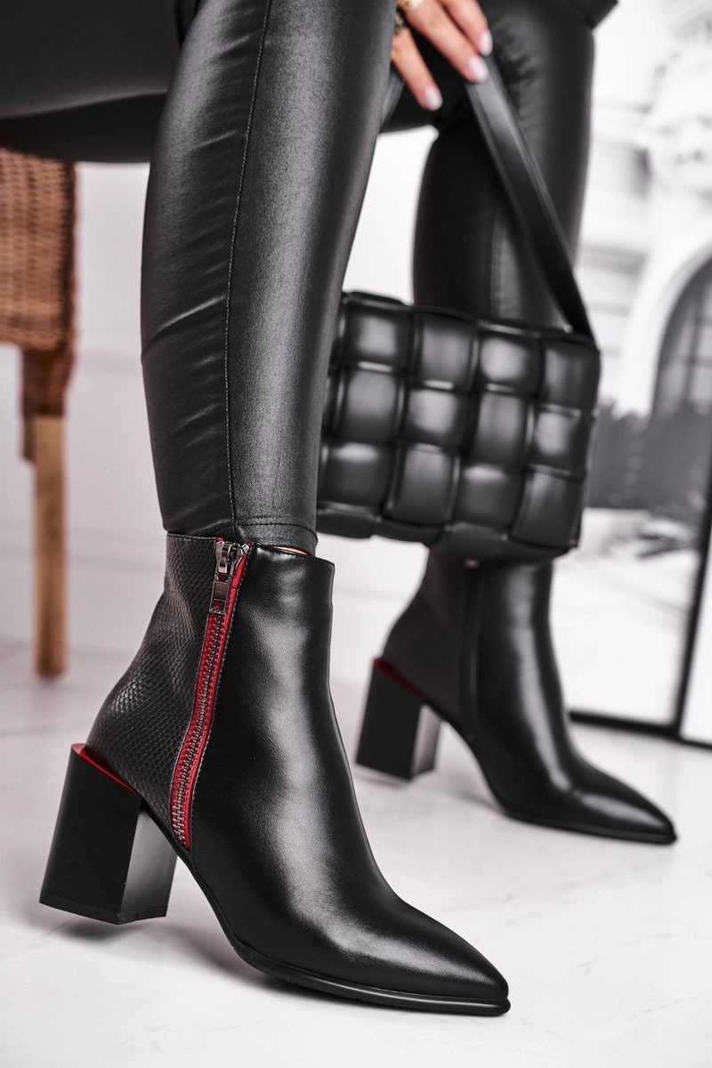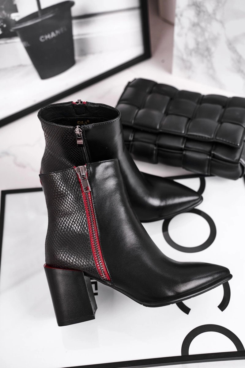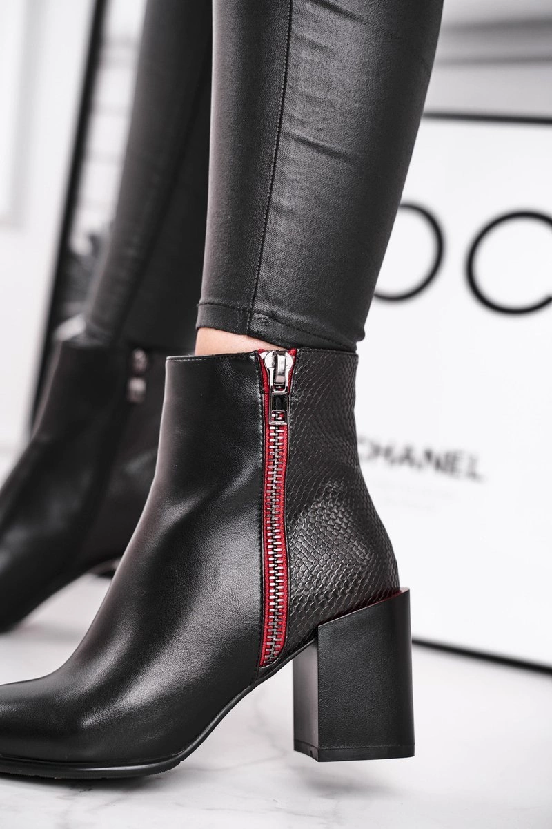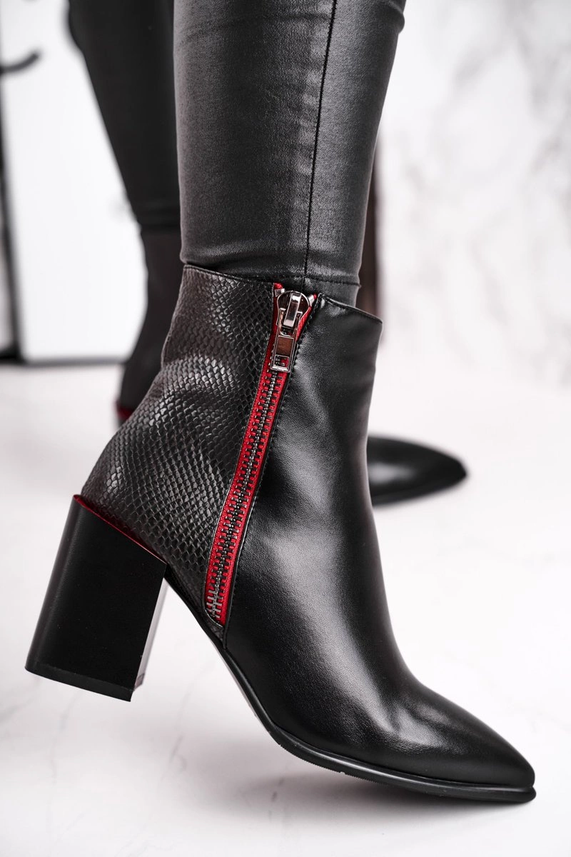 Klasyczne botki w pięknym fasonie. Botki osadzone na średniej wysokości zdobionym słupku. Buty w całości wykonane ze skóry ekologicznej, gładkiej oraz ze zwierzęcym printem. Na zewnętrznej części cholewki znajduje się duży suwak z czerwonym akcentem, który jest pięknym dodatkiem. Drugi suwak natomiast ułatwi nam zakładanie. Wnętrze pokryte kocem obuwniczym, dającym nam ciepło w chłodniejsze dni. Przy wyborze rozmiaru prosimy sugerować się tabelą rozmiarów.