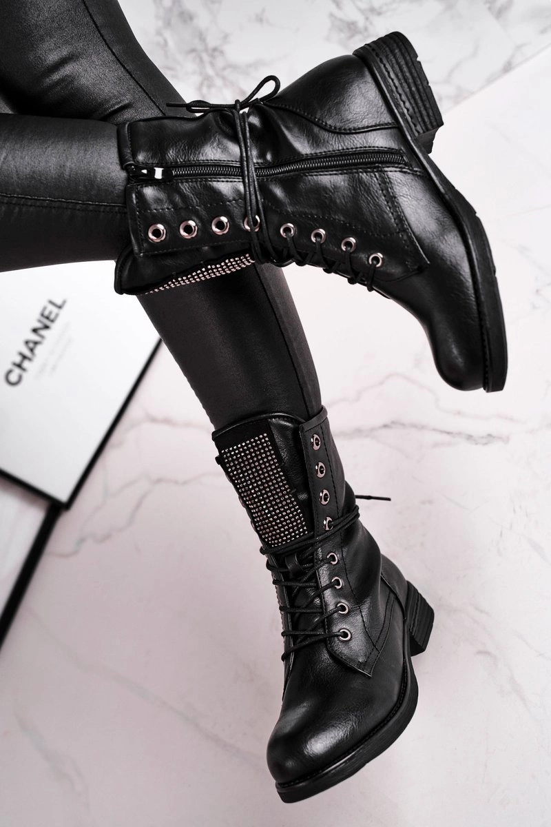 Botki Damskie Ciepłe Workery Z Cyrkoniami Czarne Seven Days