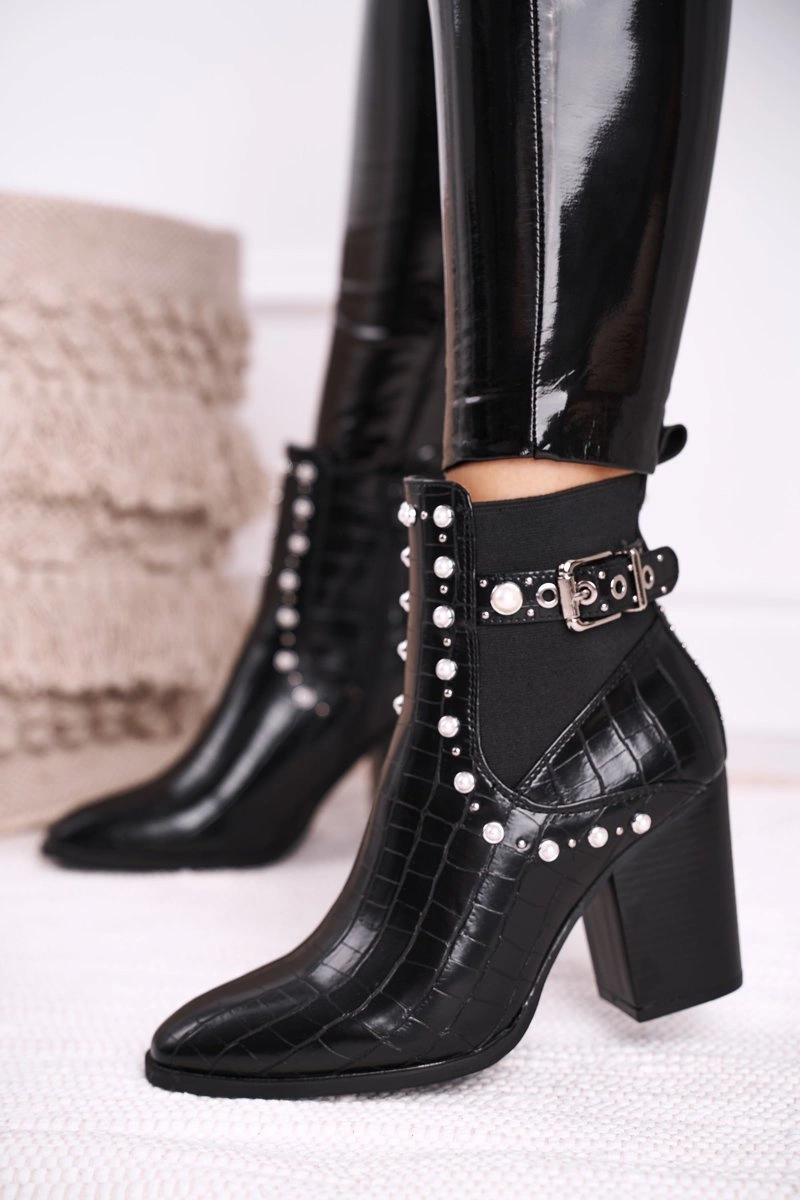 Ekskluzywne botki damskie! Wykonane ze skóry ekologicznej, ozdobione perełkami i klamrą. Zapinane na zamek. Osadzone na słupku, który uniesie Twoją sylwetkę. Ocieplone delikatnym kocem obuwniczym. Spraw sobie odrobinę nietuzinkowego look'u!