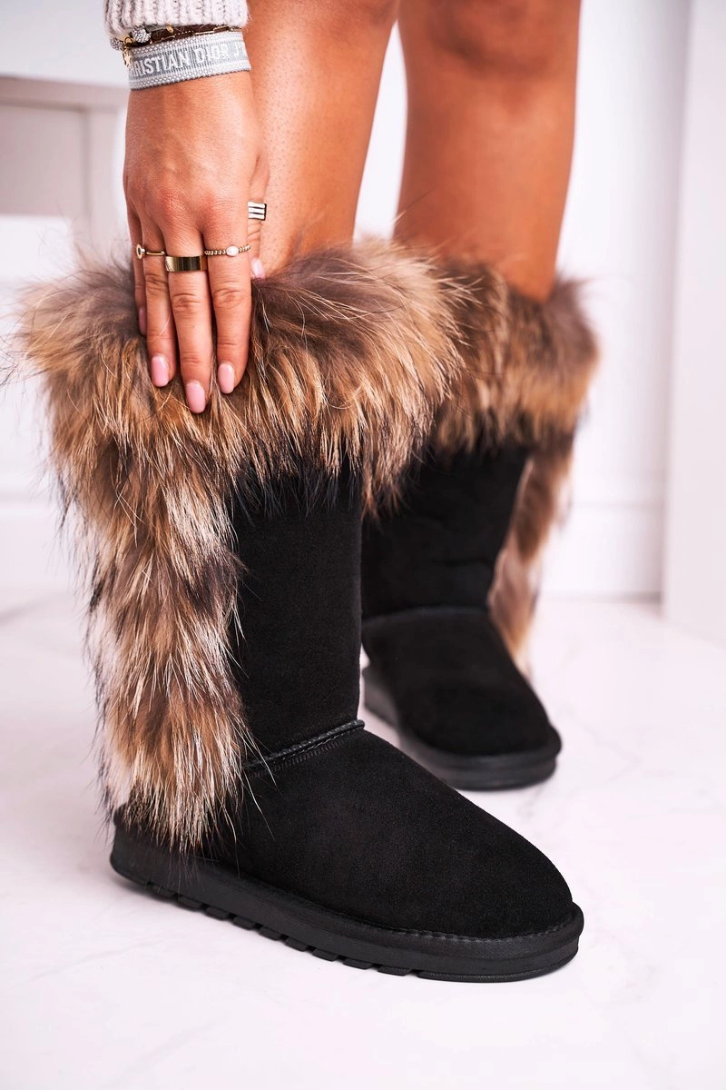 Damskie Botki Śniegowce Ocieplane Futerkiem Skóra Zamsz Czarne Balvin
