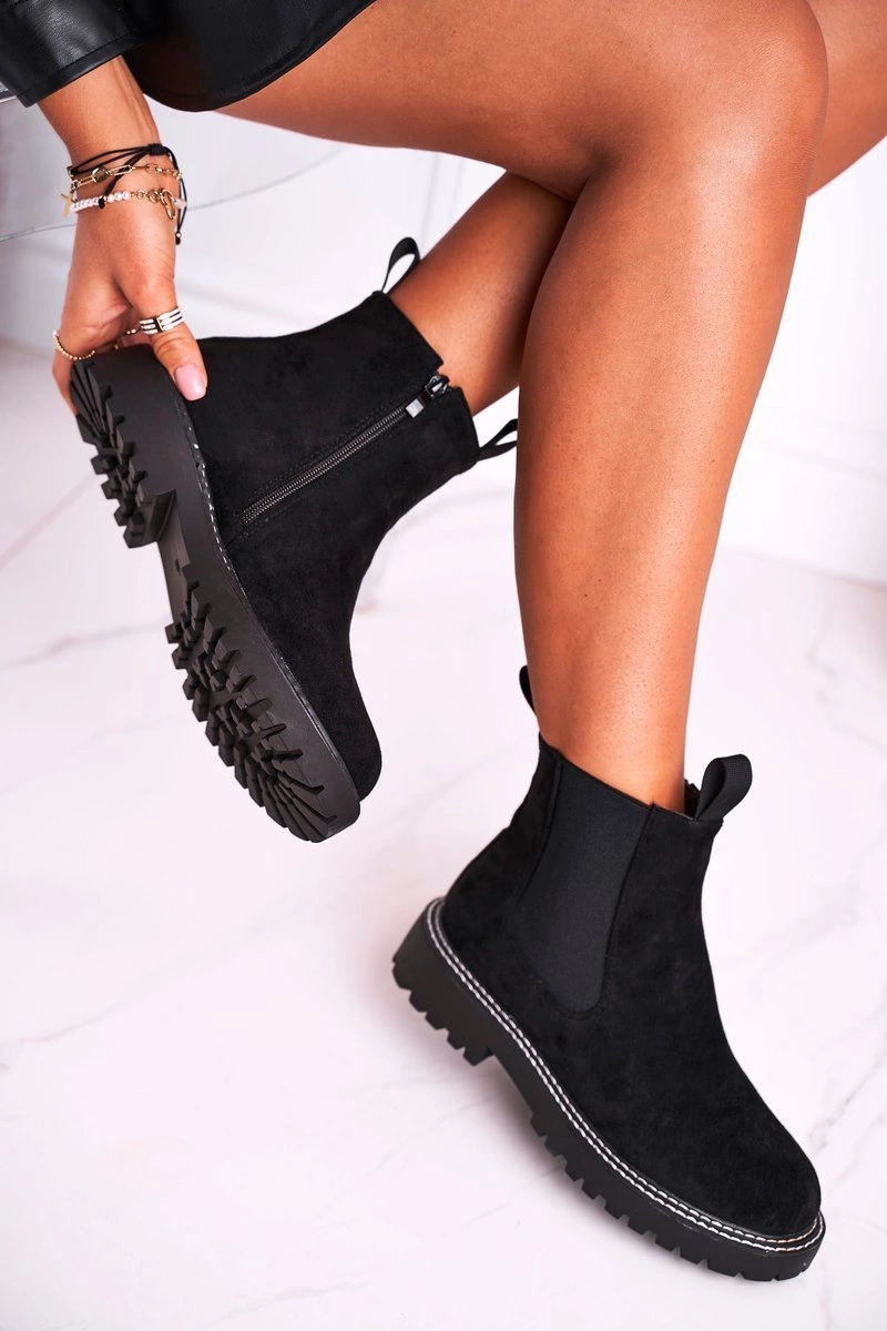 Świat mody nieustannie staje na głowie, by nas zaskoczyć. Spójrz zatem na te przepiękne botki o fasonie sztybletów! W całości wykonane z ekologicznego zamszu, wewnątrz ocieplone kocem obuwniczym z krótkim włosiem, więc o ciepło w chłodnie dni nie musisz się martwić. Wysoka cholewka z gumkami to gwarancja idealnego dopasowania a suwak po wewnętrznej stronie cholewki zapewni nam szybkie zakładanie. Przy wyborze rozmiaru prosimy sugerować się tabelą rozmiarów.