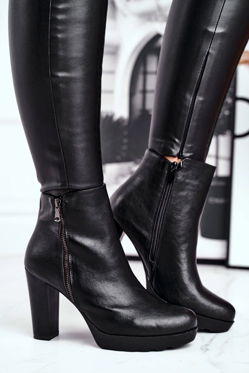 Czarne botki wykonane ze skóry ekologicznej licowej, klasyczny fason z ozdobnym zamkiem, na wygodnym słupku i delikatnej platformie, dzięki której nie odczujesz wysokości obcasa. Rozpięcie zamkiem zapewni komfort zakładania. Doskonały wybór na jesienne czy wiosenne spacery. Przy wyborze rozmiaru prosimy sugerować się tabelą rozmiarów.