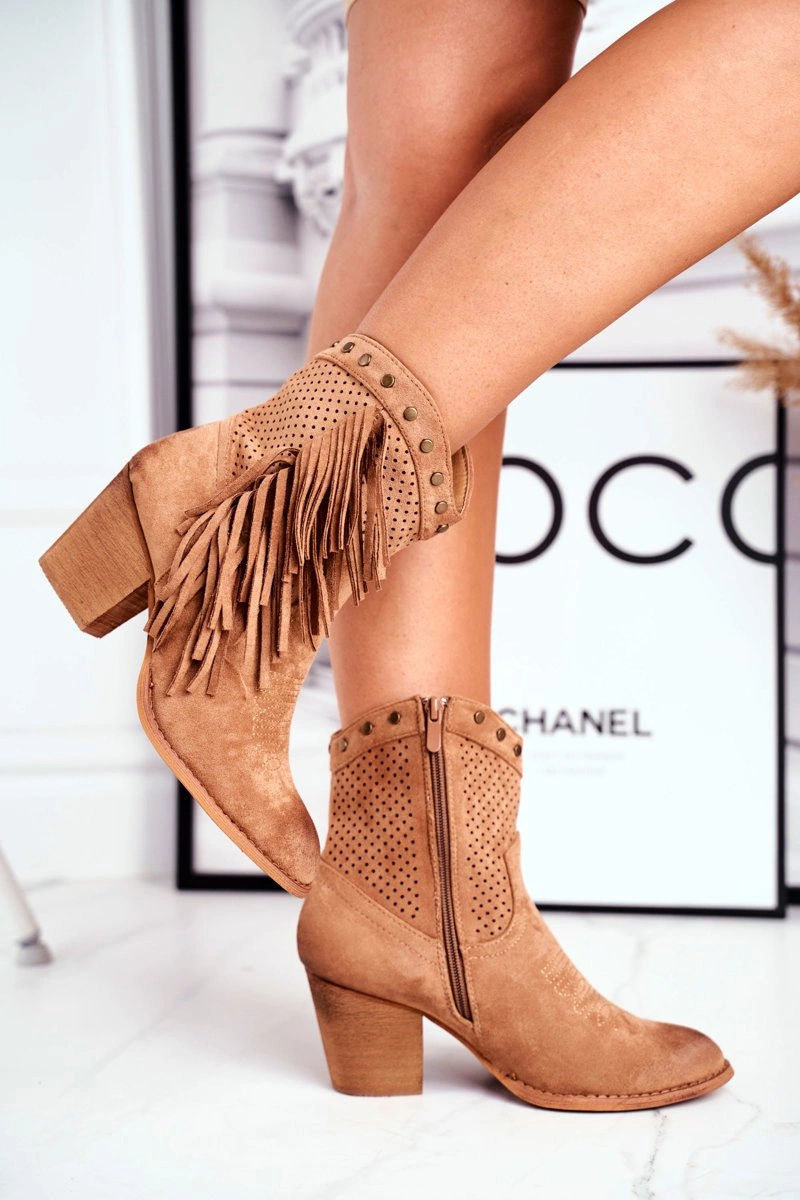 Botki Damskie Na Słupku Z Frędzlami Kowbojki Khaki Michelle