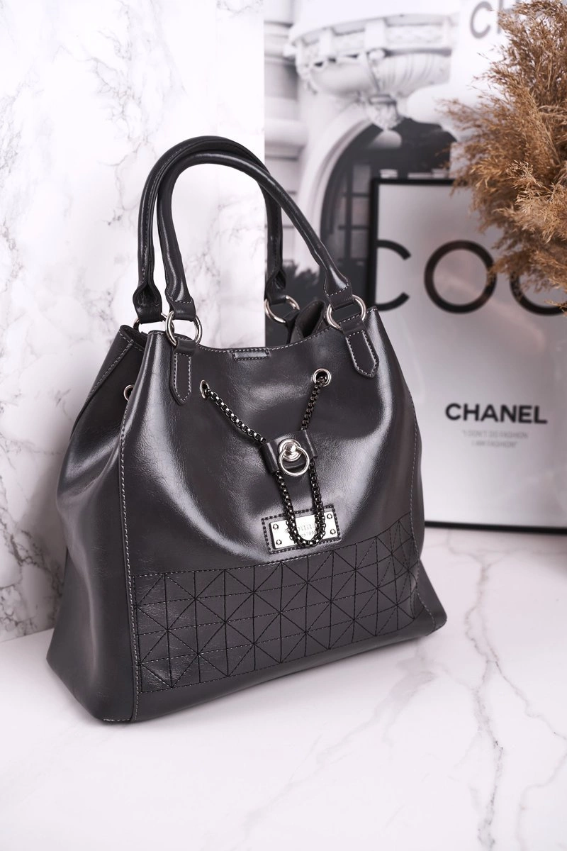 Elegancka wielofunkcyjna torba damska z oryginalną zawieszką. Torba średniej wielkości, zawieszona na krótkich rączkach, zapinana na magnes. Model ma drobny wzór na dole przedniego panelu. Wewnątrz znajduje się dodatkowa, mniejsza torebka z odczepianym paskiem, która może służyć jako kosmetyczka.