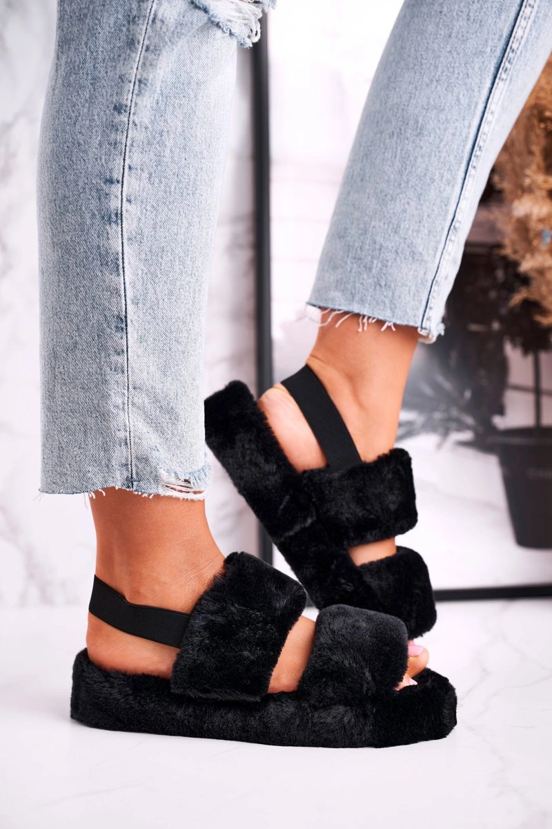 Papcie Damskie na Platformie Futrzane Czarne Cotton Candy