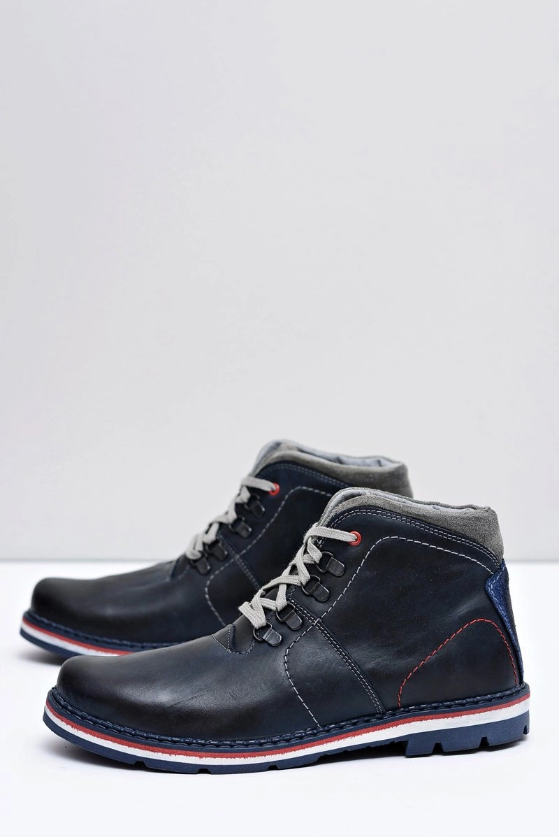Granatowe Męskie Skórzane Ocieplane Botki Teslo