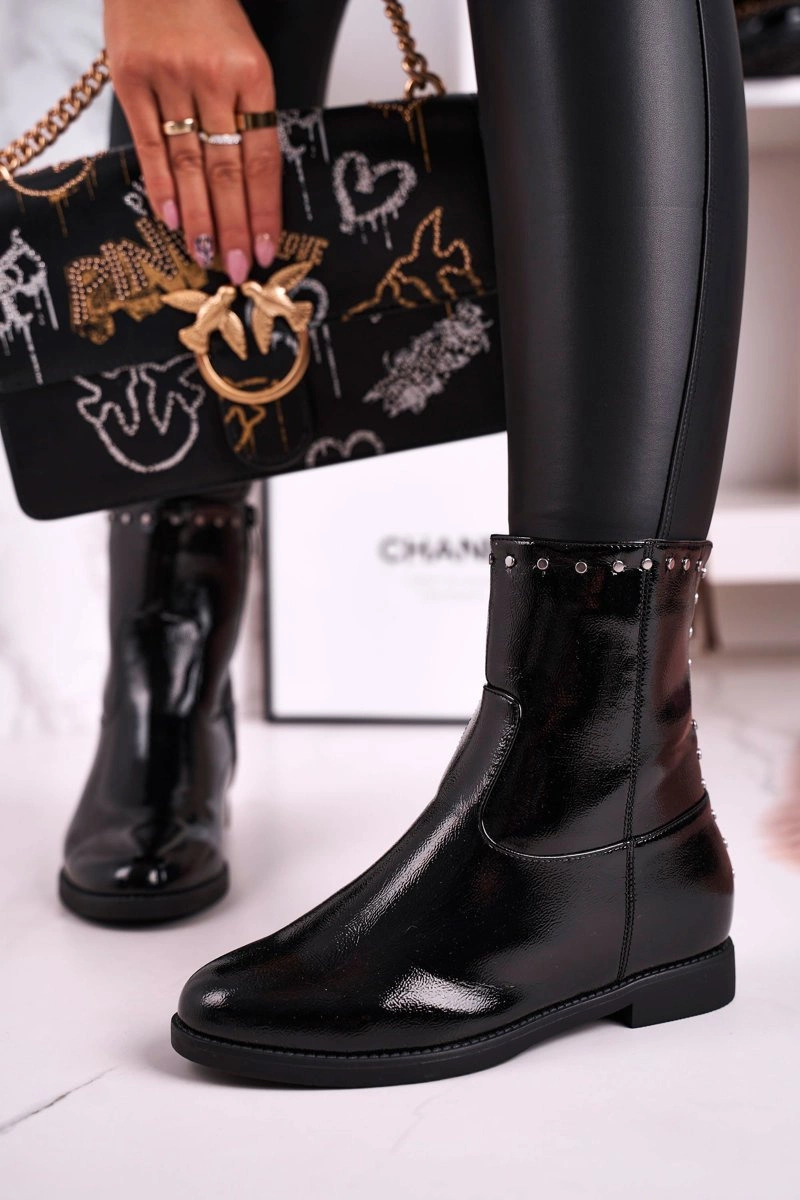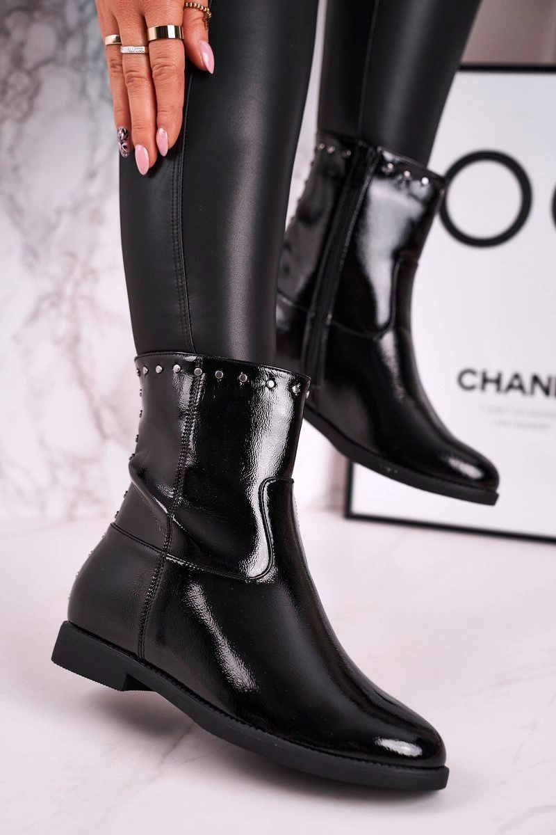 Damskie Ocieplane Botki Na Koturnie Lakierowane Czarne Performance