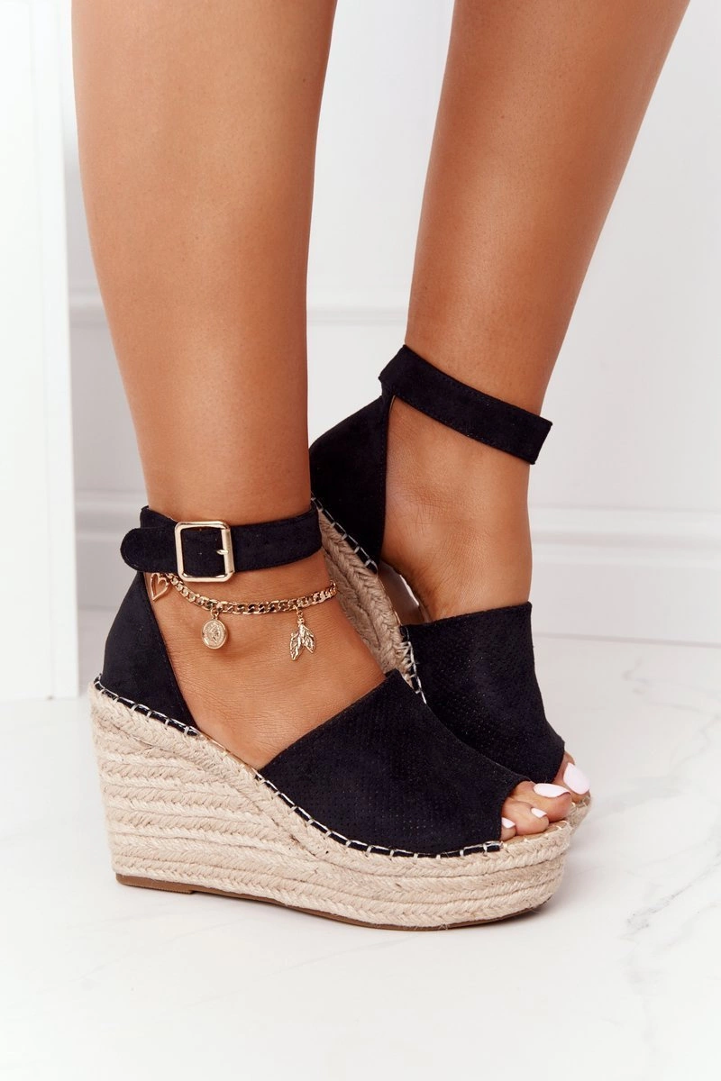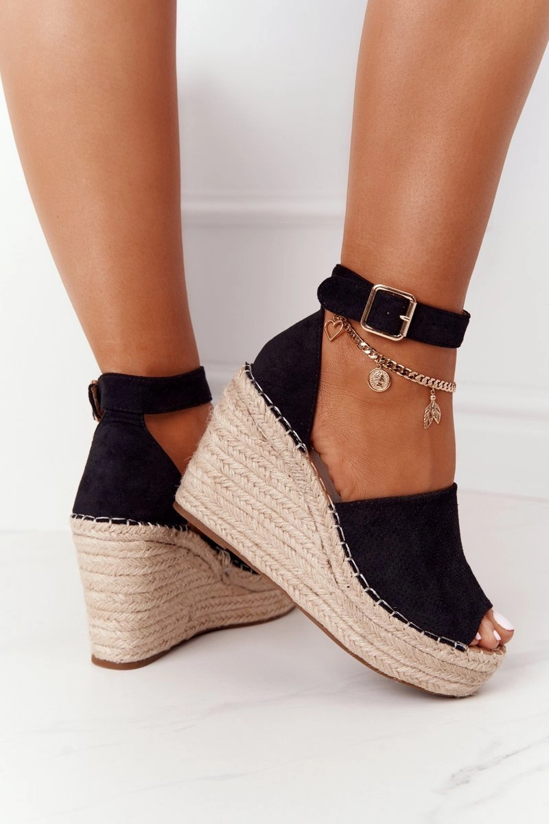 Sandały Na Koturnie Z Plecionką Czarne Makenna