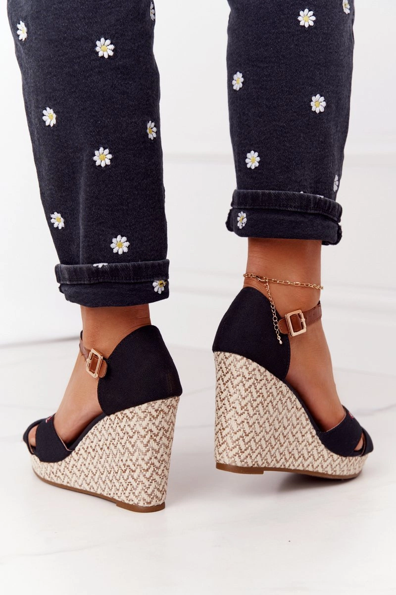 Sandały Na Koturnie Z Plecionką Czarne Lobos