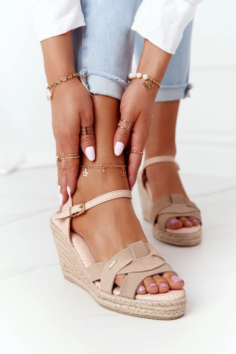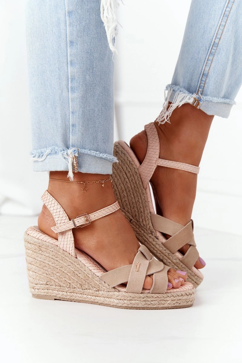 Skórzane Sandały Na Koturnie Big Star HH274380 Beżowe