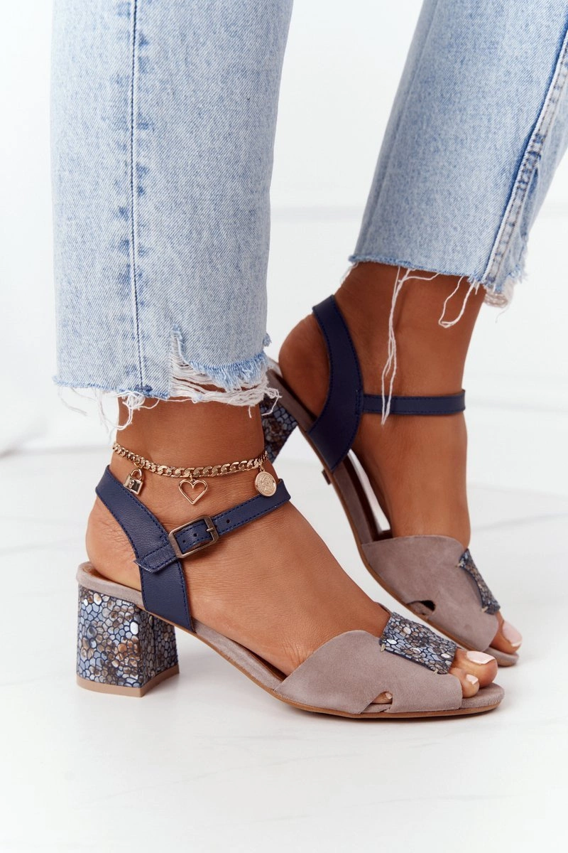 Skórzane Sandały Na Obcasie Maciejka 04120-43 Beżowo-Granatowe