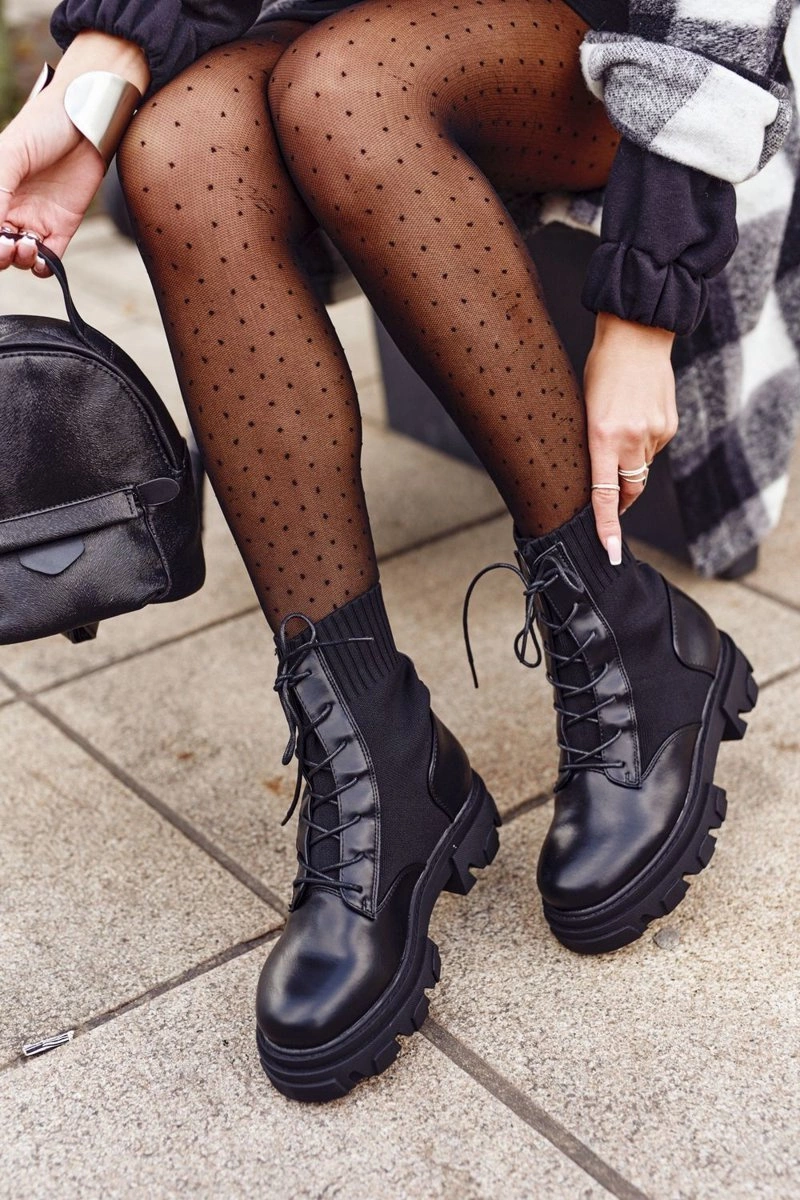 Piękne botki damskie z materiałową cholewką. Wykonane zostały z eko skóry na grubej podeszwie. Przy wyborze rozmiaru prosimy sugerować się tabelą rozmiarów.