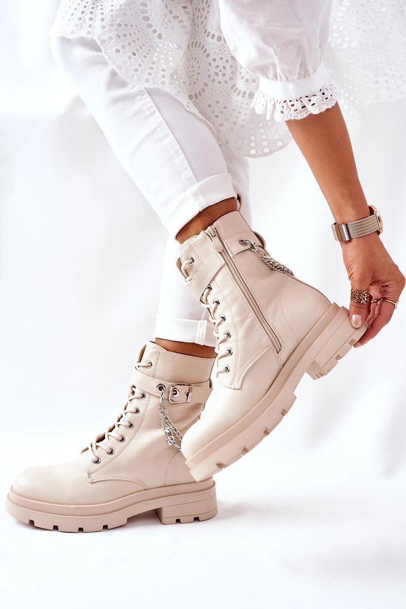 Niezwykłe i stylowe botki wykonane ze skóry ekologicznej. Zapinane na zamek oraz klamrę. Dodatkowy ozdobny łańcuch na cholewce. Przy wyborze rozmiaru prosimy sugerować się tabelą rozmiarów.