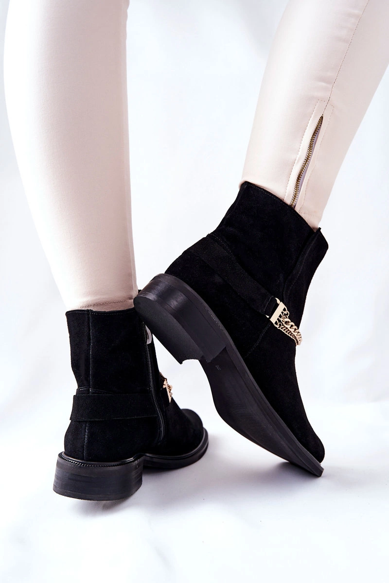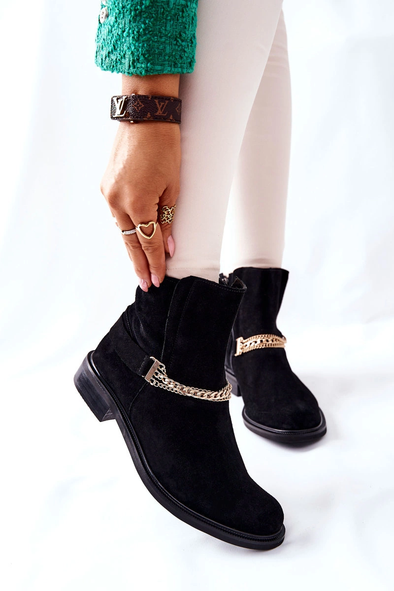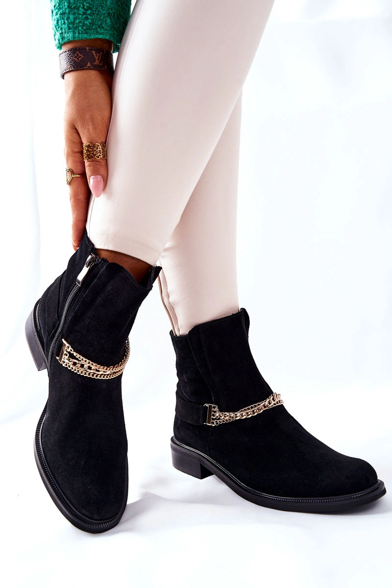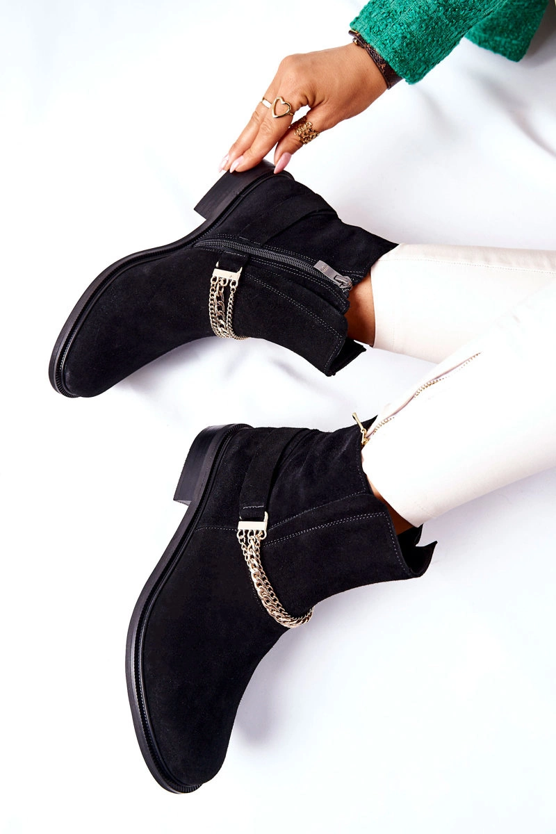 Damskie botki, w całości wykonane są z miękkiej naturalnej skóry nubukowej, z dbałością o każdy detal. Wyjątkowy model zdobiony delikatnym łańcuszkiem wzbogaci Twoje stylizacje. O Twój komfort zadba skórzana wkładka oraz miękka, przyjemna w dotyku cholewka. Koniecznie sprawdź całą naszą kolekcję butów skórzanych. Przy wyborze rozmiaru prosimy sugerować się tabelą rozmiarów.