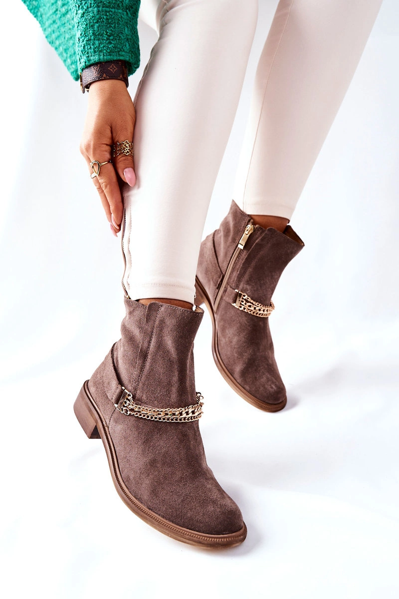Damskie botki, w całości wykonane są z miękkiej naturalnej skóry nubukowej, z dbałością o każdy detal. Wyjątkowy model zdobiony delikatnym łańcuszkiem wzbogaci Twoje stylizacje. O Twój komfort zadba skórzana wkładka oraz miękka, przyjemna w dotyku cholewka. Koniecznie sprawdź całą naszą kolekcję butów skórzanych. Przy wyborze rozmiaru prosimy sugerować się tabelą rozmiarów.