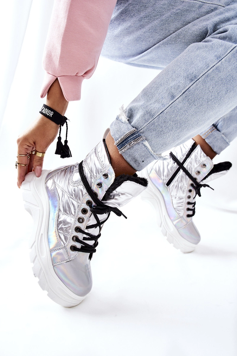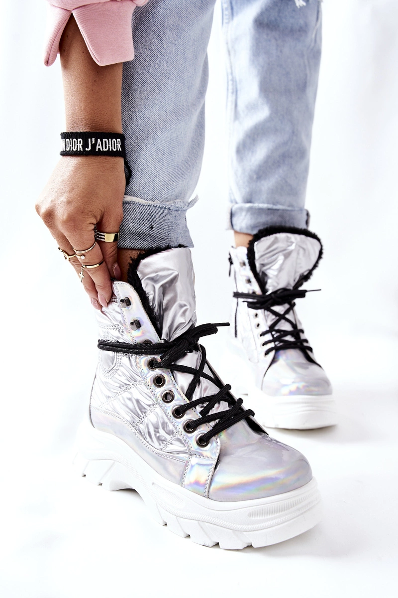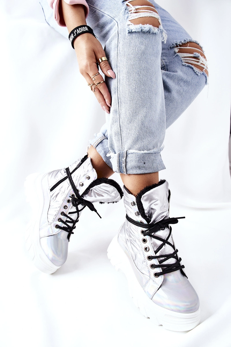 Damskie ocieplane botki wykonane ze skóry ekologicznej. Sznurowane oraz zapinane na zamek. Idealne na zimę.