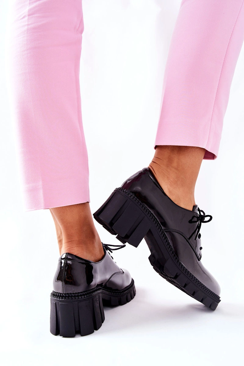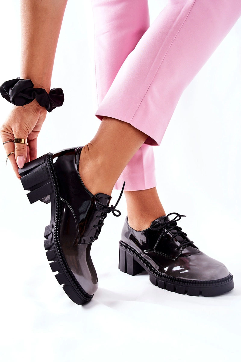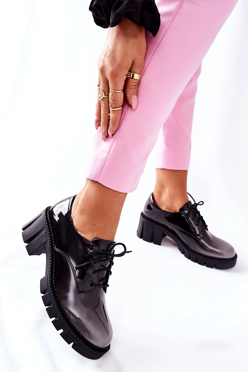 Półbuty zostały wykonane z wysokiej jakości lakierowanej eko skóry. Miękka wkładka ze skóry naturalnej to gwarancja komfortu. Buty charakteryzują się podeszwą z gumowego tworzywa. Wiązanie sprawia, że można dopasować je do własnych wymagań. Niewysoki, masywny obcas zapewnia wygodę. Przy wyborze rozmiaru prosimy sugerować się tabelą rozmiarów.